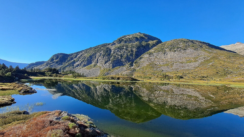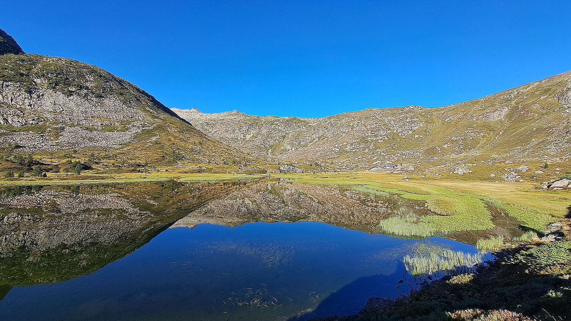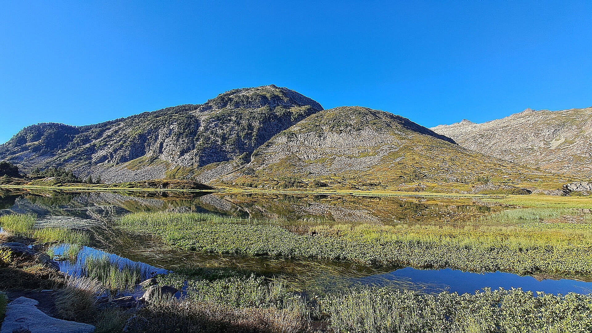 However, amongst our breaking camp breakfasts, and organising ourselves, we lost each other in the refuge area! So much for two trekkers navigating their ways alone across a mountain range .. we can do that, but not find each other leaving a small Aire de Bivouac! So, I set off slowly wondering if she had already started! I spent a long time admiring the stunning mirror surfaces of the lakes I had visited yesterday. I was slightly elevated on the GR10, and the morning light made perfect reflections. It was truely amazing. The inversion of the mountains on the surface was beautiful, I only hope the photos can give the feeling of awe I had when stood there.