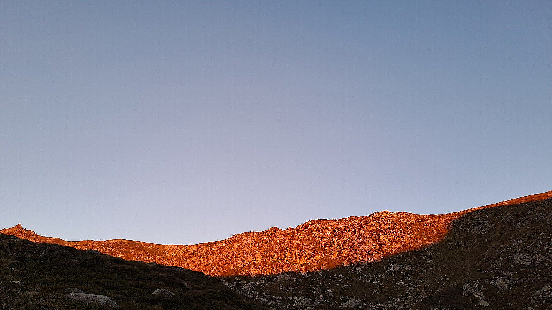 Despite the visual signs of warmth on the mountains, the sun hadn't yet reached the valley floor where we were camped. The absence of any direct sunlight in early mornings high in the Pyrenees generally means cold temperatures, and this particularly cold morning meant my Reynauds Syndrome was on full display this morning! I find it is definitely getting worse as I age, and it is very sensitive to cold temperatures. It can get pretty down heartening as I find the debilitating effect it has on my fingers so frustrating when I need to do things such as packing up camp! Anyway, I was here in the beautiful mountains with another day of trekking ahead of me, and they would warm up soon in the approaching sunshine!