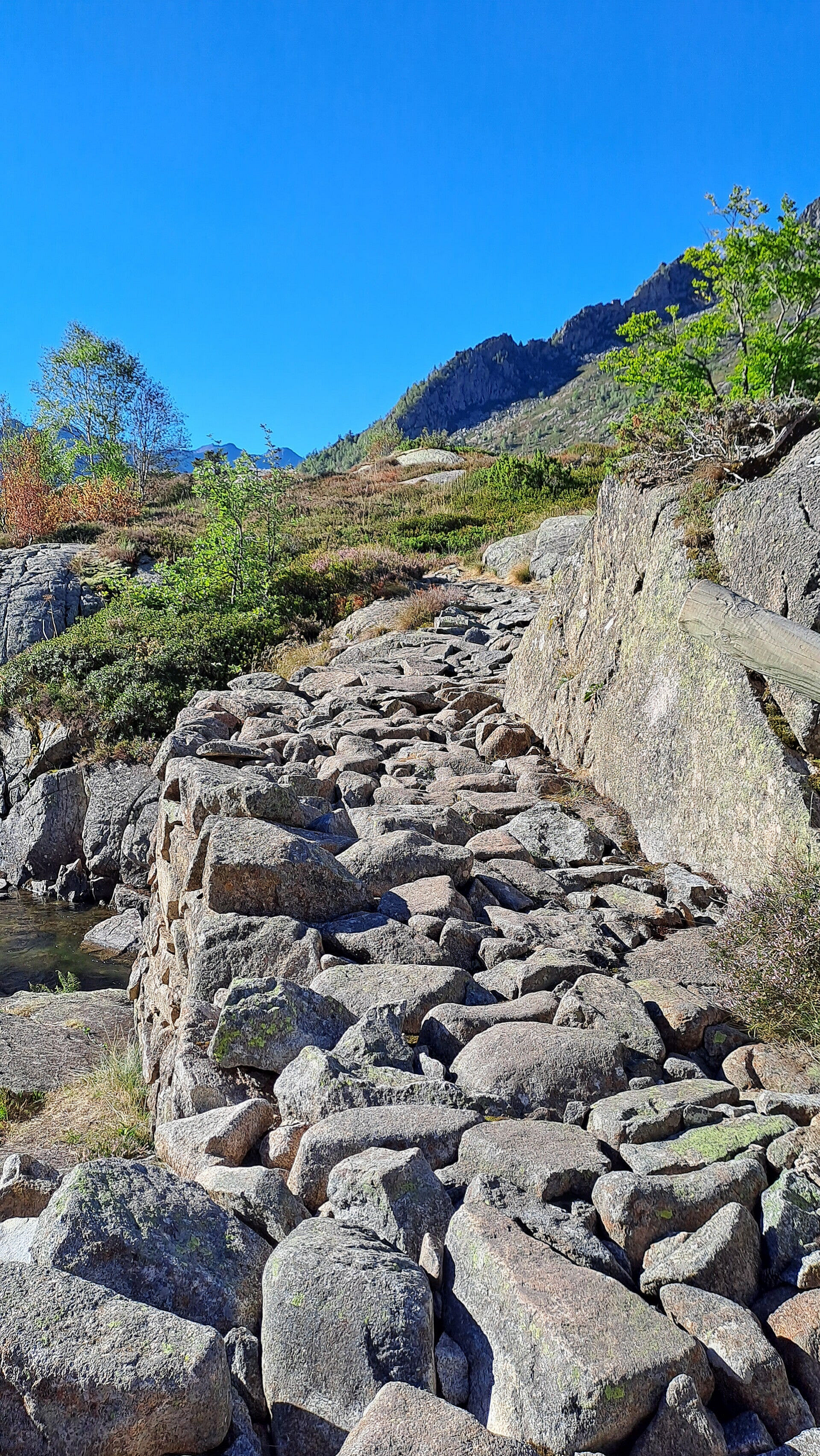 Carrying on along the attractive valley the stoney mountains on either side had sparse coverings of vegetation, often in patches. Pic du Far (1924m) was to our left, with the bigger Cap de Fum (2463m) and Pic de Sauve (2315m) to our right. A section of well constructed rock path led to a lovely little feature of the morning.