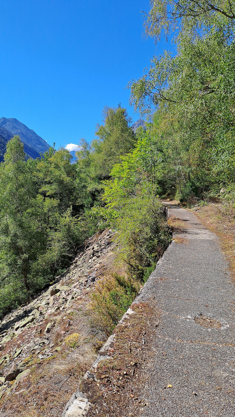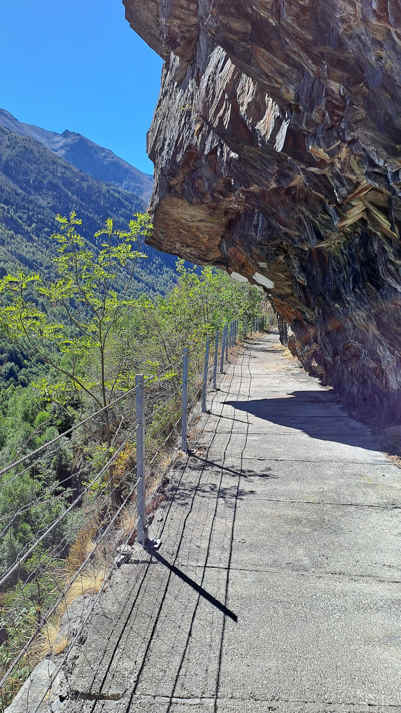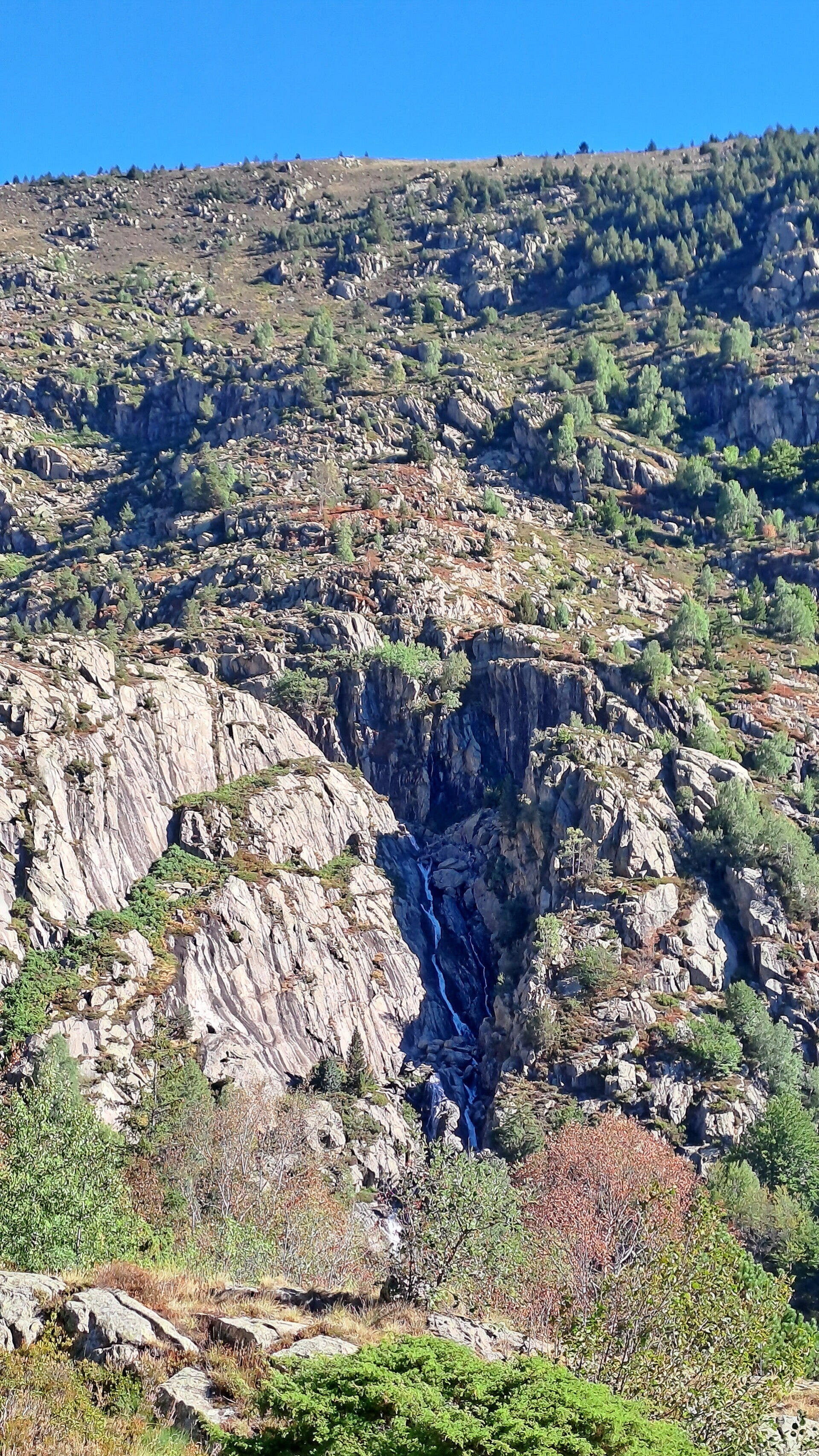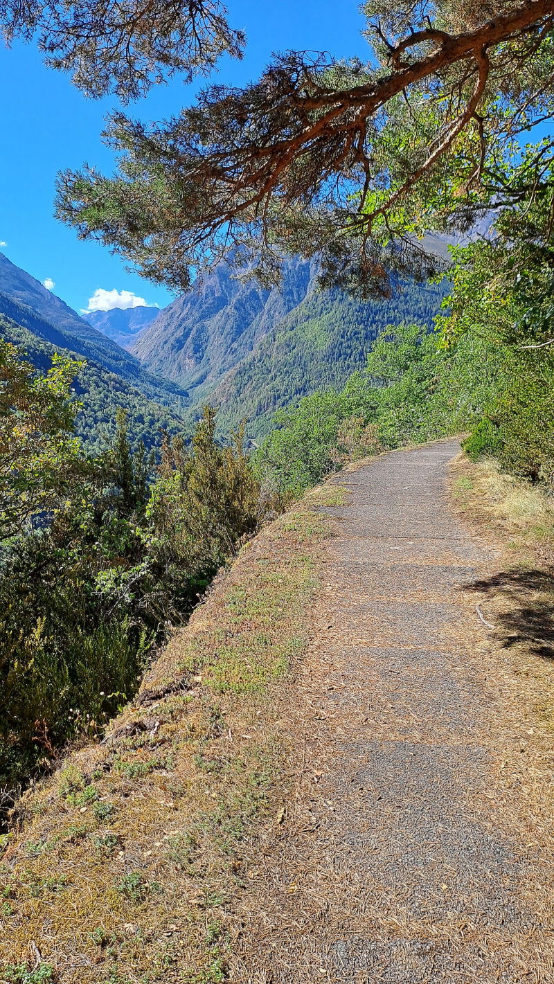 After the flat valley, the GR10 started to head towards the steep descent to Marc. The day was hot, and there was a welcome misty shower under a huge Hydro-electric pipe. We thought the misty spray was a defect in the pipe, maybe it would burst and flood the valley?! Then we saw the entire pipe was sprayed, maybe a cooling mechanism we concluded, but also a great relief to trekkers on a very hot day!