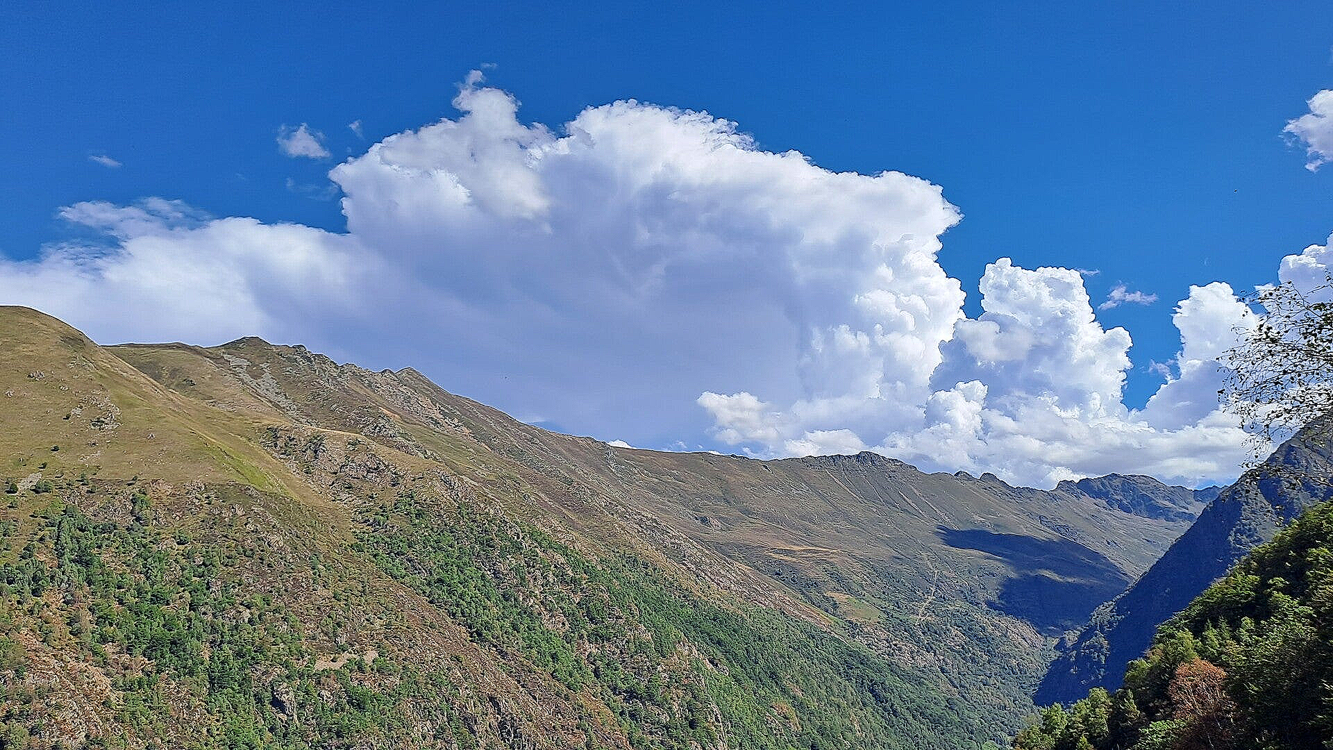 With the increasing rumblings and inevitability of a storm somewhere around I started a classic Craig beasting up a climb. My mountain fitness and strength was impressive now, if I can say that with humility?! I did interrupt the beasting of the climb to check out the views behind me. I love looking back at the ground covered and feeling emotional about it. The dark cloud and lightning up ahead was in total contrast to the serene views when I turned around! It wasn't the most beautiful valley to climb, but I felt a sense of peace that was only interrupted by the concern of what sort of camping place I might find! I knew I would have to ascend all the way to Ètang D'Izourt as the ground on the way up was all too rough for camping.