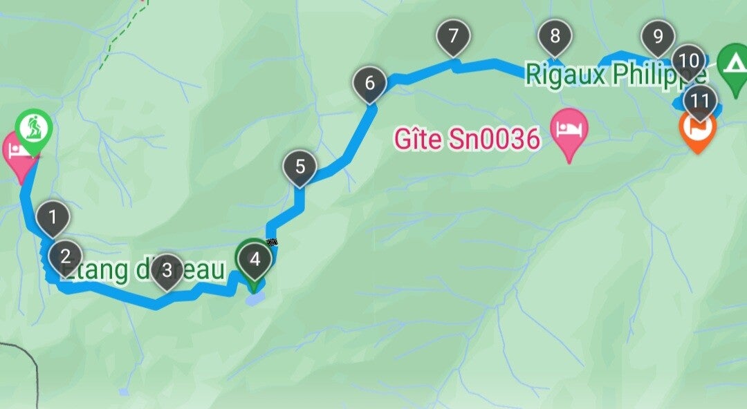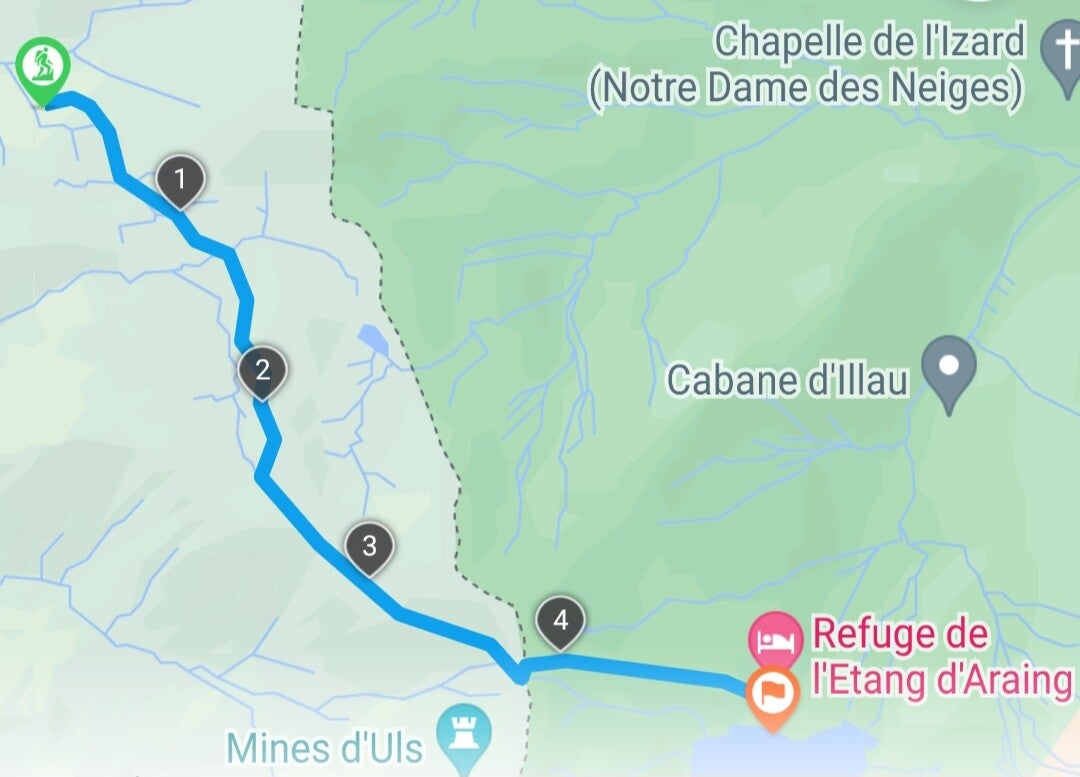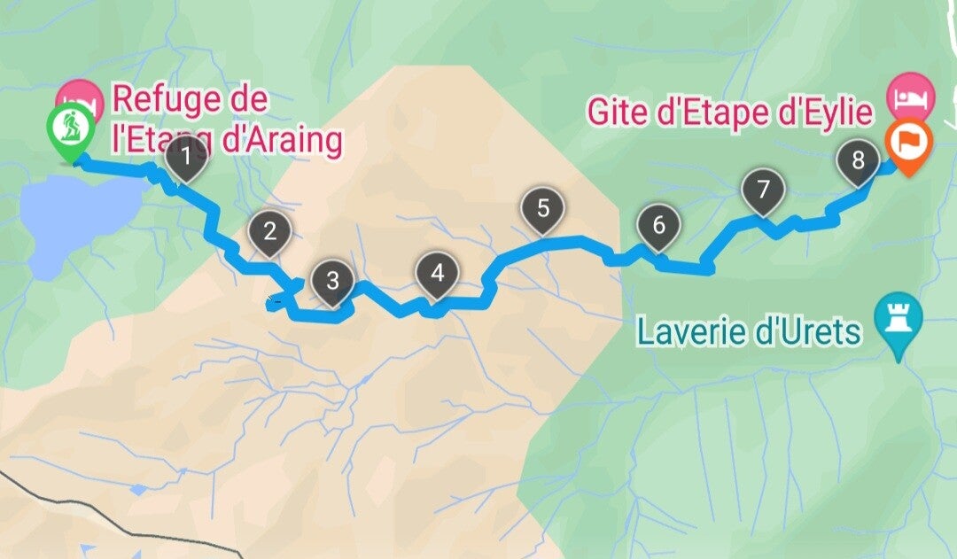 - Finish: Aire de Bivouac at Refuge des Étangs de Bassies (1665m)
