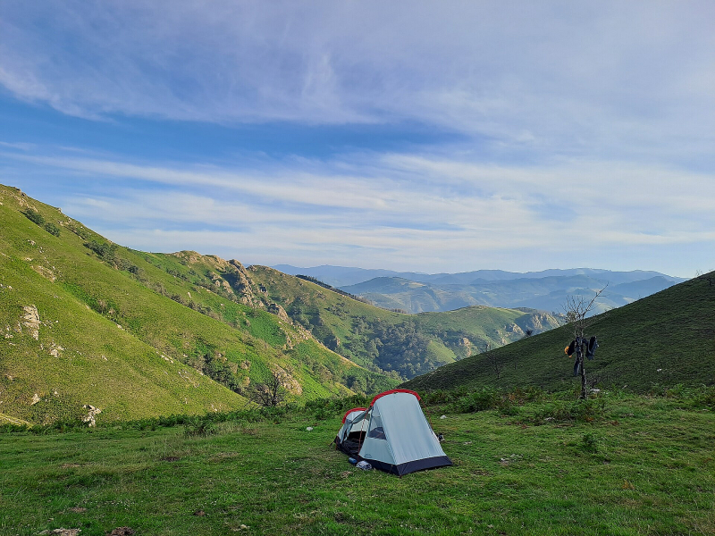 I called it a day at Col de Joncs (421m), a small pass with nice views North and South, that looked good for a wild camp. I set up my first camp relieved that it was so quiet, so I couldn't be seen practising how to get things right! I hung out my sweaty gear to dry on a convenient little tree, and then cracked open the large, family sized Cassoulet tin I'd carried up. It was pretty damn good for a couple of Euros! I sat in my tent door, admiring the day cooling down. The tranquil evening was fantastic, admiring the beauty of even these small Basque foothills was humbling. I had just arrived from flat as pancake Norfolk though!