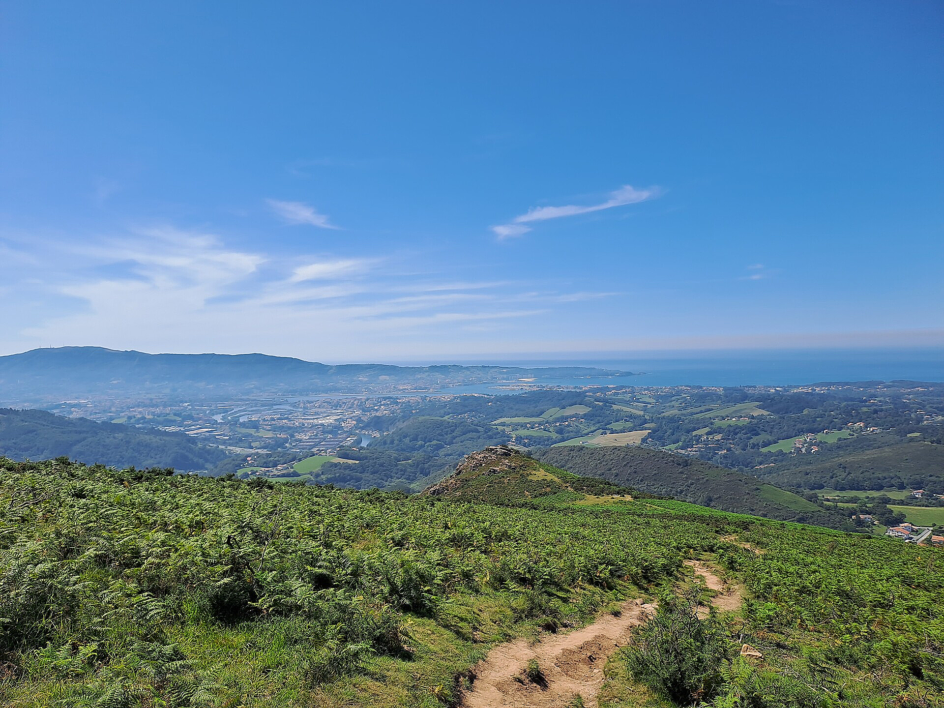 Half an hour later and with batteries recharged I started up the climbing path of Xoldoko Gaina, a 486m peak. Paths weren't too bad, but the onslaught of the heat made it tough. After bypassing the peak and checking out the views back to Hendaye, I passed a French guy whose dog was not in a good way at all due to the heat. I gave him some water which I thought I could sacrifice as he had none left. Not a pleasant thing to see, but I had to carry on. I briefly chatted with an old German couple who had only decided to attempt the whole GR10 two days ago after sailing here from Hamburg! Might see them again, who knows? Maybe one day I'll have such a life I thought whilst walking slightly up and past Osingo Zelaia (392m), through the unattractive pass of Poiriers Lepoa (316m), and along the slopes of Faalegi (484m).