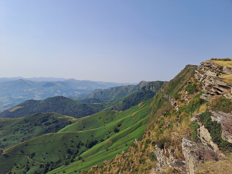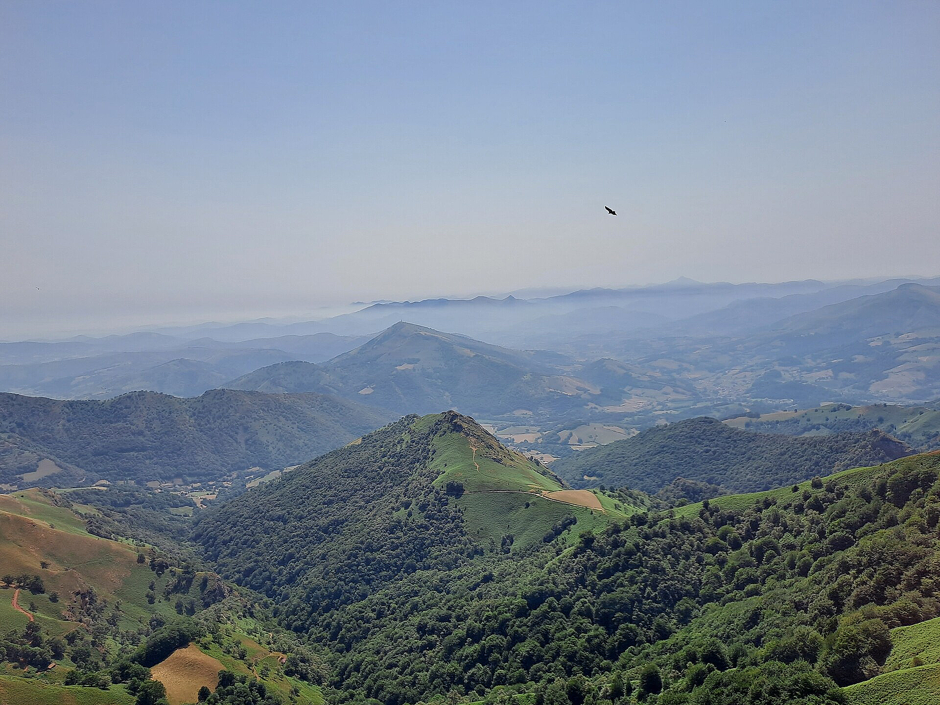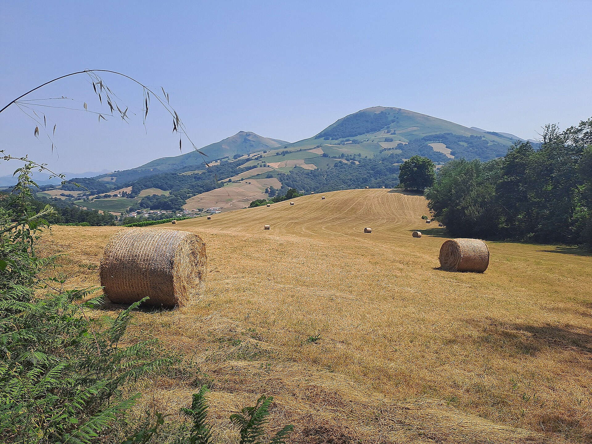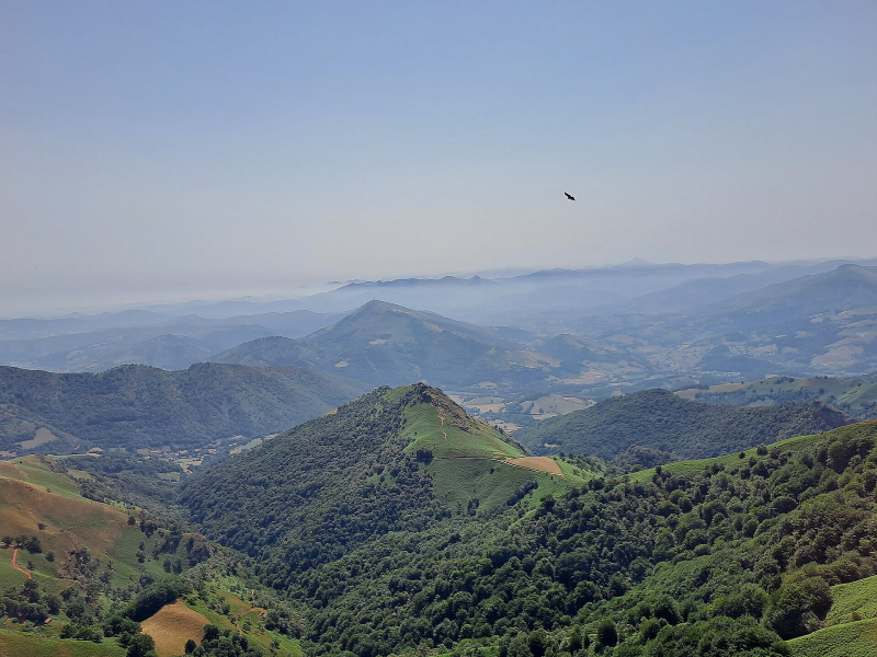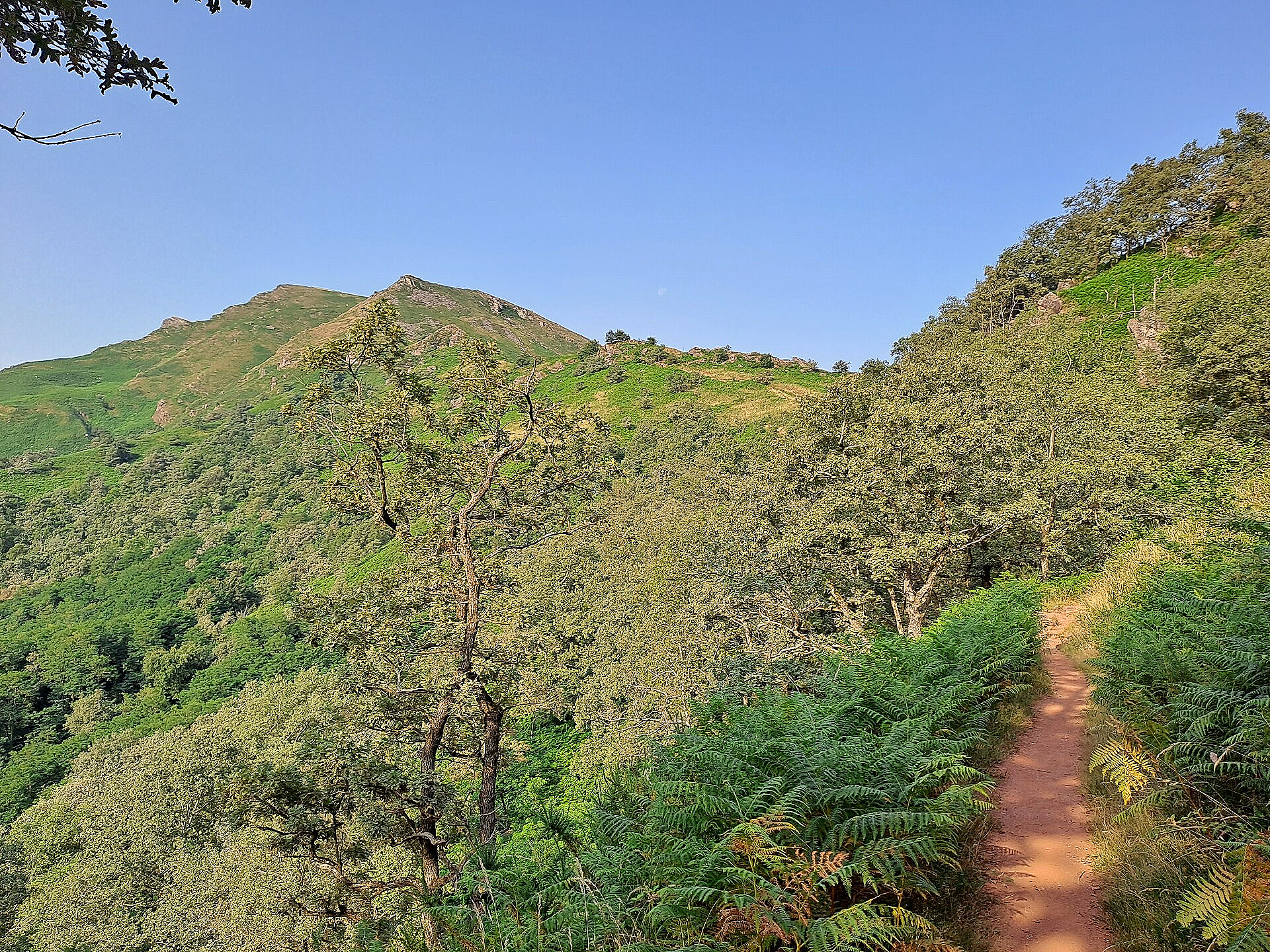 My issues with reading means I tend to flick through stuff, or just not finishing reading things properly, so I'd not anticipated the additional climb before the descent! However, it was pleasant coming up through the forest from Col d'Harrieta to reach Astate (1022m), then a dip and a rise to the once again sun exposed Buztanzelhay (1029m). Now it was time to descend! First steeply to Col de Buztanzelhay (843m), then along narrow paths cutting into the sides of Aintziaga (905m) and Arrokamendi (730m) before a track and then road into Bidarray. The paths down provided great views, but this valley or side or area was a heat trap with zero air circulation, so with my concerns re very recent heat related illness I took it easy, but quick enough to not suffer in it too long!