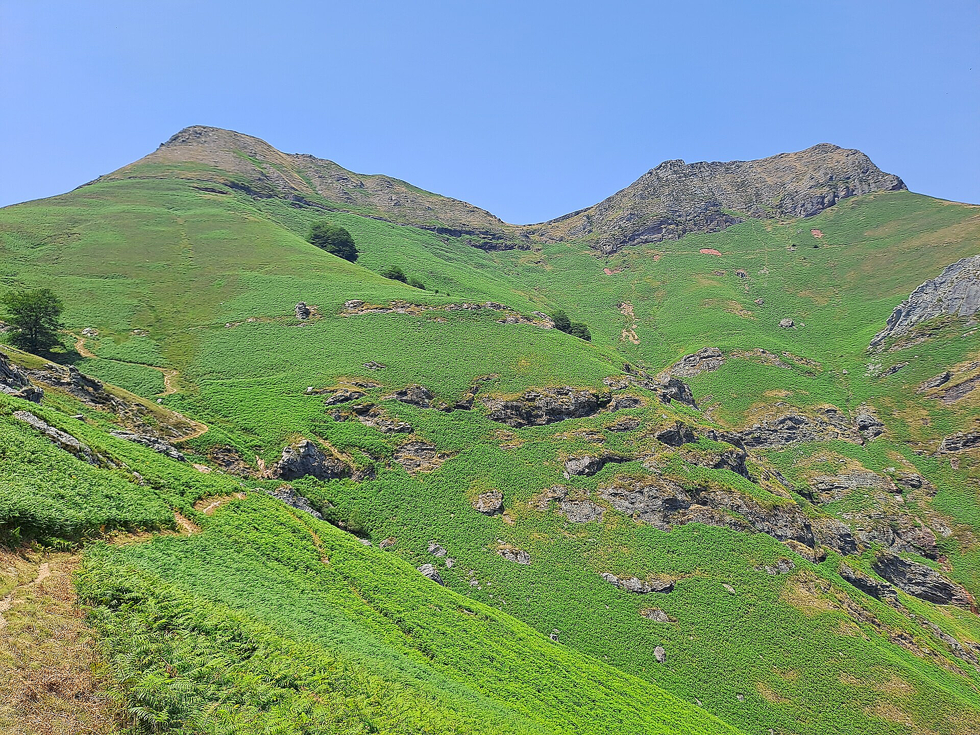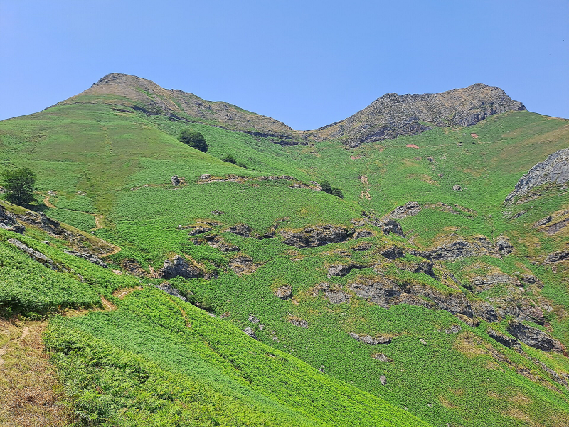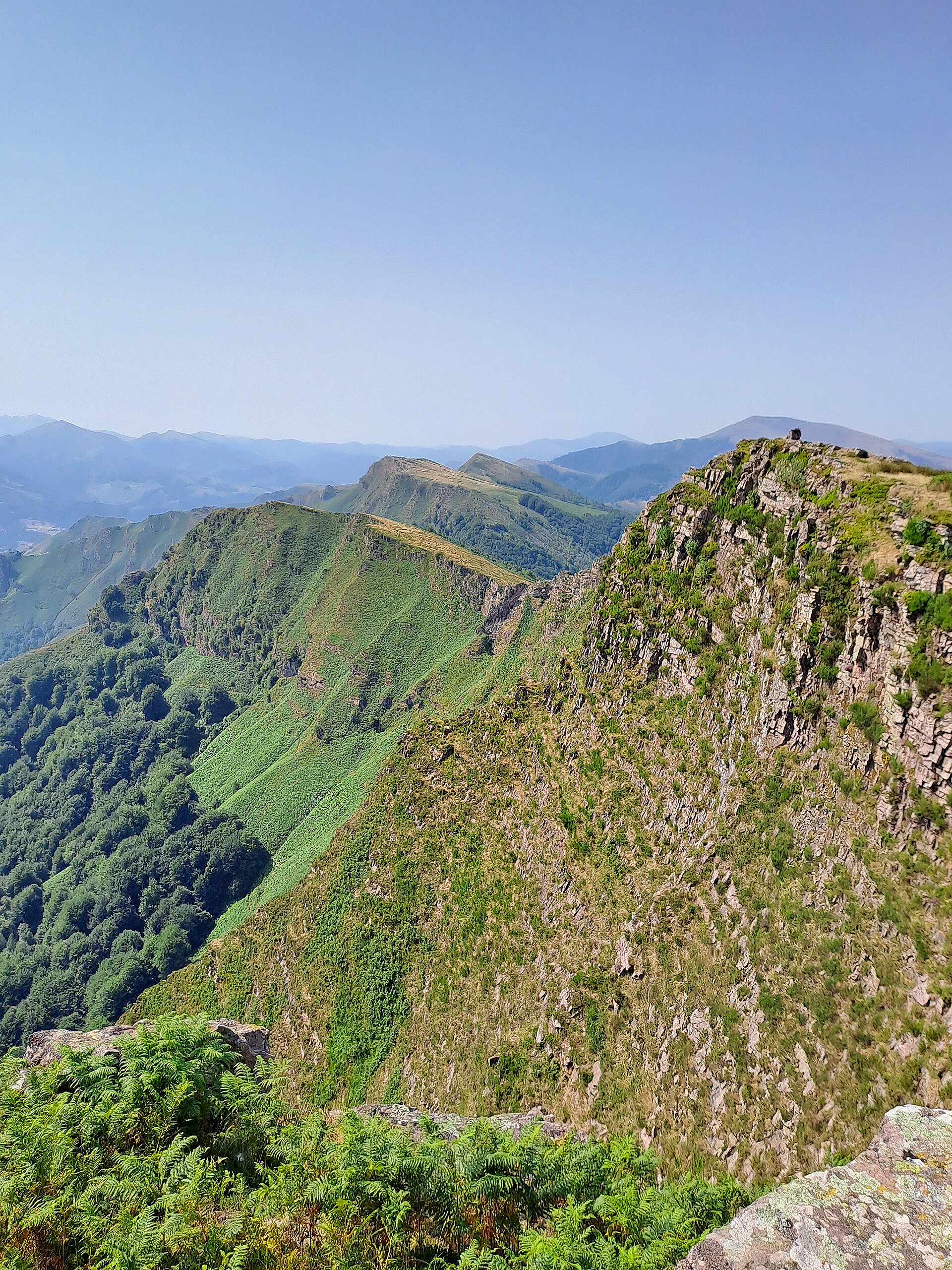 The road rose fairly steeply out of Bidarray and I was passed by two trail runners. Had seen a fair few so far, some very fit people running these paths and mountain roads! Soon a narrow path left the road and just before it entered some forest I had to climb barbed wire that some bugger of a farmer had attached across the trail! It was obviously to manage the livestock but in other places they make these clever wire 'gates', whereas this idiot had just fenced it with barbed wire! With fear of ripping 'Superpack' I negotiated it with style and grace .. well let's just say I got over in one swearing piece! And to my relief so did 'Superpack'! Once into the forest the path hit the around 45 degree or more steepness that seems a feature of a Pyrenean GR10 climb! It was during this climb that I realised by no means was I fully recovered from what I had drained from my body over the last few days. With all the various fitness things I've done throughout life I'm fairly in tune with my body and it's strength and I knew it was struggling. I had anticipated full 'mountain' fitness would develop in the 1st week, but this was different, a sense of being drained of strength. I had developed a lived experience of the seriousness of heatstroke/exhaustion (I'm not sure of the difference but whichever one affected me didn't matter, it knocks your system for six!). I also started to fully realise just how far I took it without asking for help, silly Craig!! However, the pains au chocolat were an awesome idea fuelling slow steps with frequent pauses that saw an hours climb exit the really steep forest section into ferns and a lovely view of the Crêtes d'Iparla ahead.