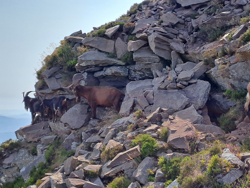 The Crêtes d'Iparla are a series of ridges with sheer cliffs to one side and fairly steep grassy slopes to the other. Once up all the steep climbing the trail reached Col d'Iparla (950m) showing the Crêtes ahead. It then tracked the cliff edge side of the ridges providing stunning views down until the highest point Pic d'Iparla (1044m). All the time there were what I thought were Eagles spiralling up the thermals and then soaring impressively along the ridges. I commented to a hardy mountain looking French couple about the beauty of the Eagles .. non non non .. wrong Craig! They are Vultures! Good job I've had private school education most of my life! Anyway, still a very impressive sight to trek along to. Another impressive animal was some horned beasts I encountered shading themselves on steep rocks, not sure of their proper name!
