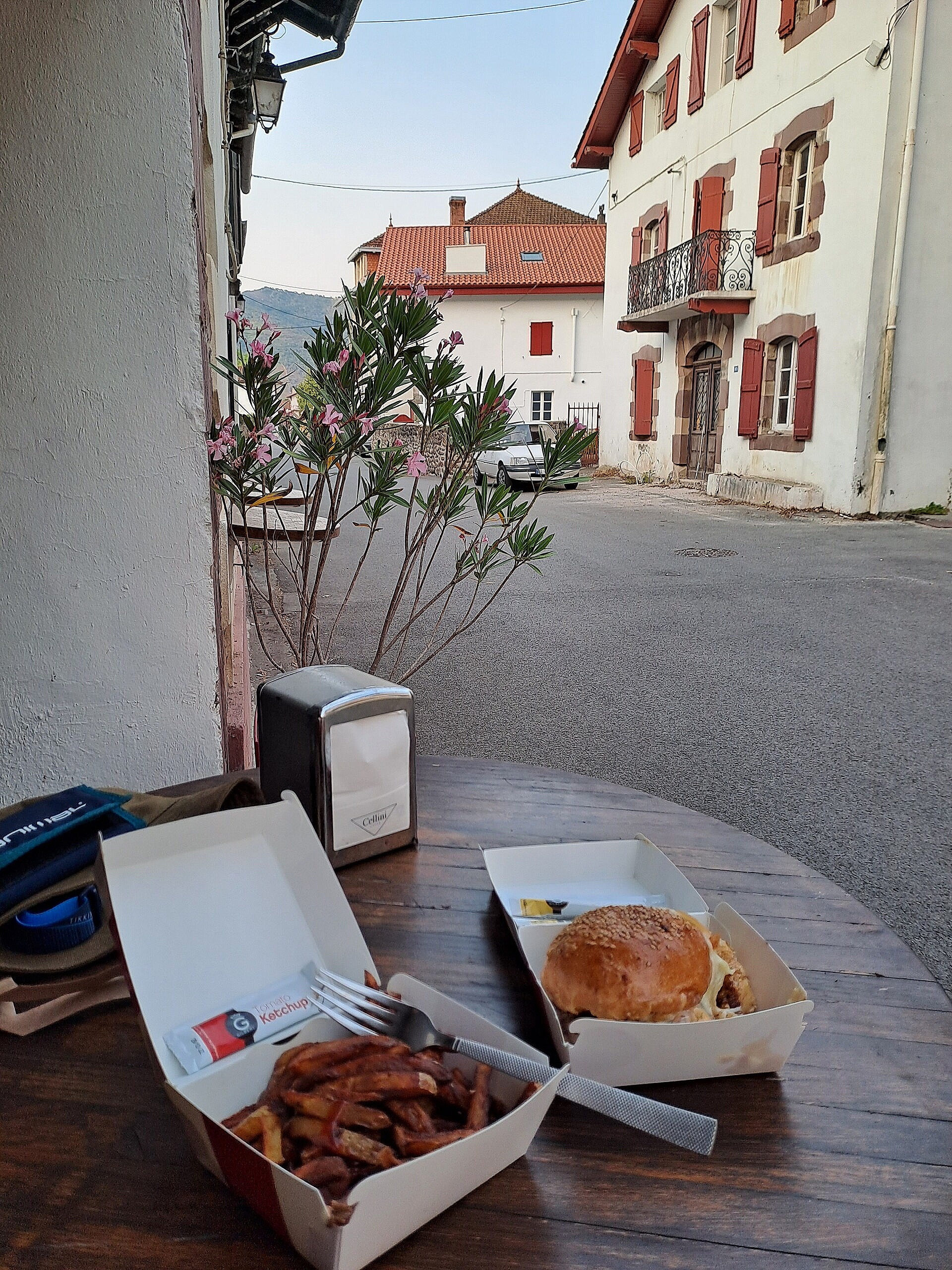 I had pizza fantasies running wild in my head so I set out for the walk through the village to get one when the heat had cooled off enough. To my horror they were too busy to accommodate my fantasy! I could see why, there were two people crowded into a small pizza kitchen with the 30 odd degree heat outside, ouch! I was kindly sent the way of a gite that should be open and doing food. It was further into the village which was really attractive, with a lovely mountain village main street. To my delight the gite was open, and the very friendly couple who's gite it is did the most amazing homemade burger and frites that I was able to eat on their huge oak barrel table right on the village street! So all in all, worked out a treat! All that was left for me was a very content amble 'home' reflecting on the day I'd had, and feeling really happy I'd managed to resolve all the initial problems. I was also feeling relieved I'd managed to get the mind right so as not to skip the stage. In hindsight I know what I'm like, and if I had I would never have forgiven myself! I'm not naturally kind to myself, something I'm working on! But, I was allowing myself to feel proud that despite all the early 'teething' problems, oh and near collapse, I was still on my GR10 journey.