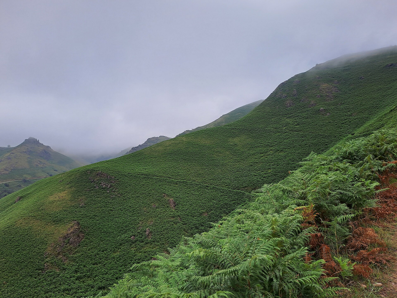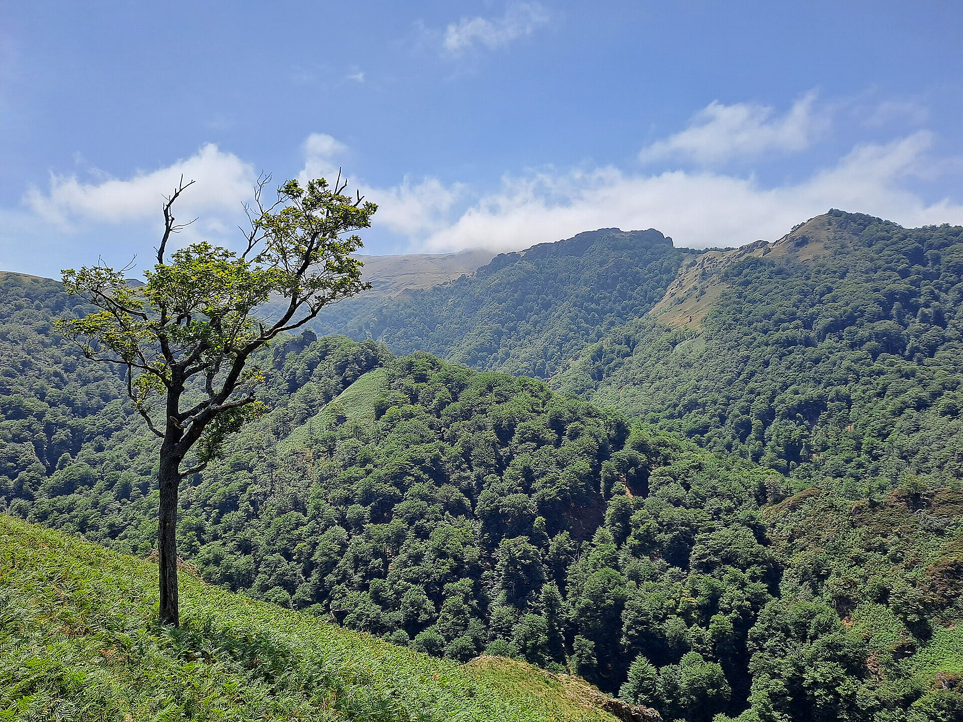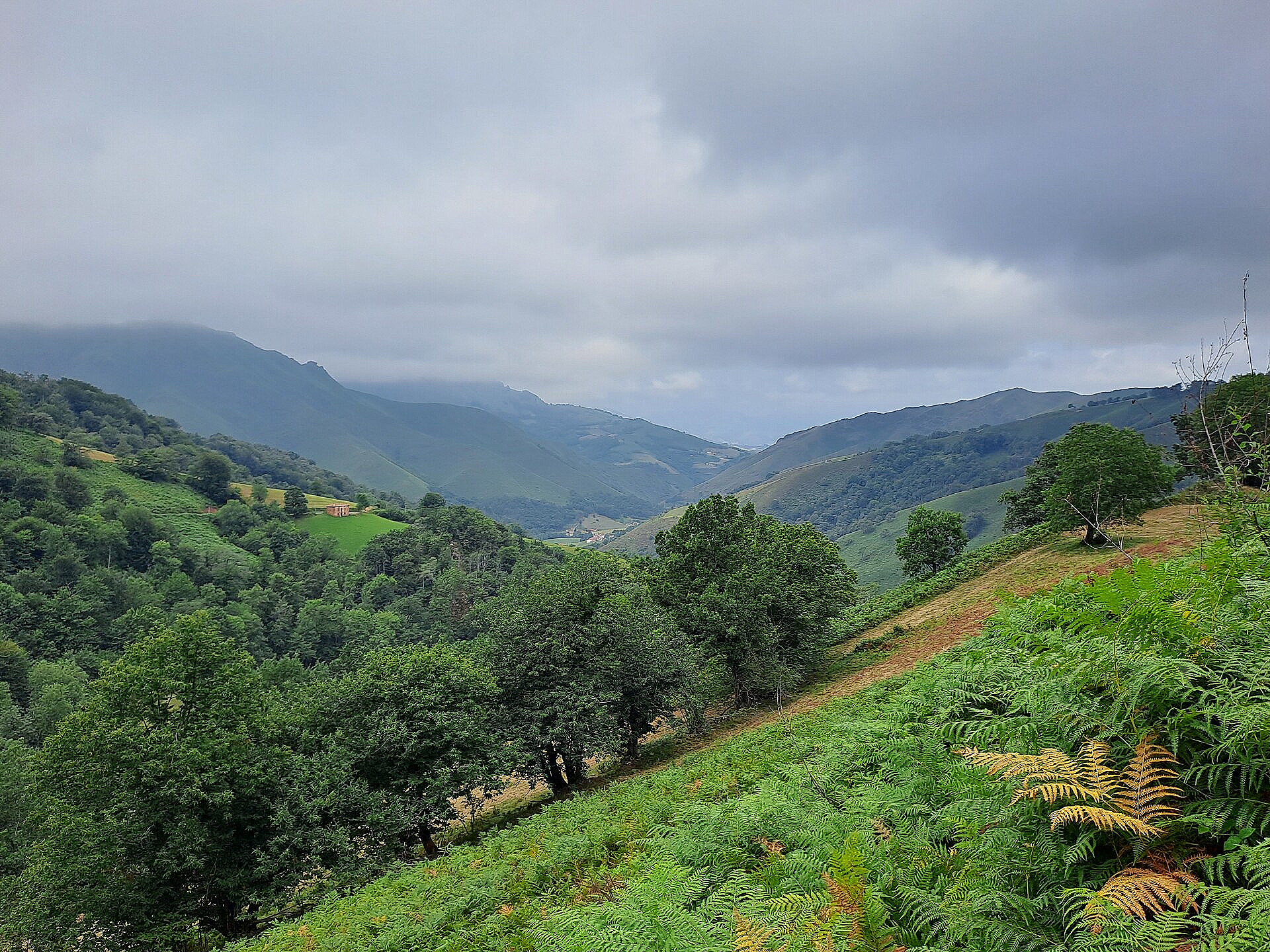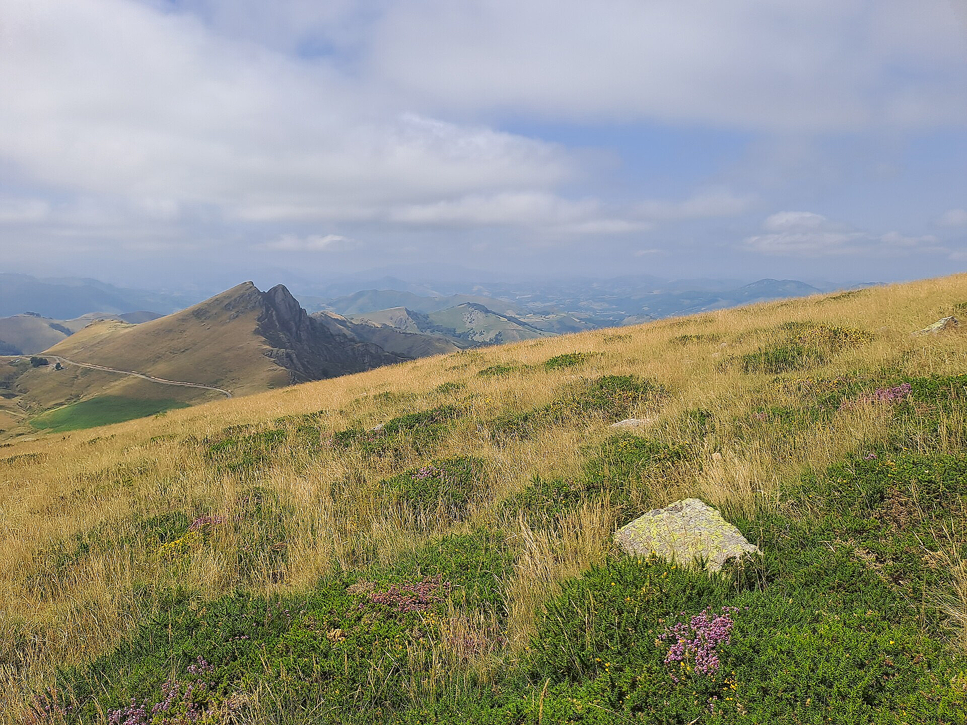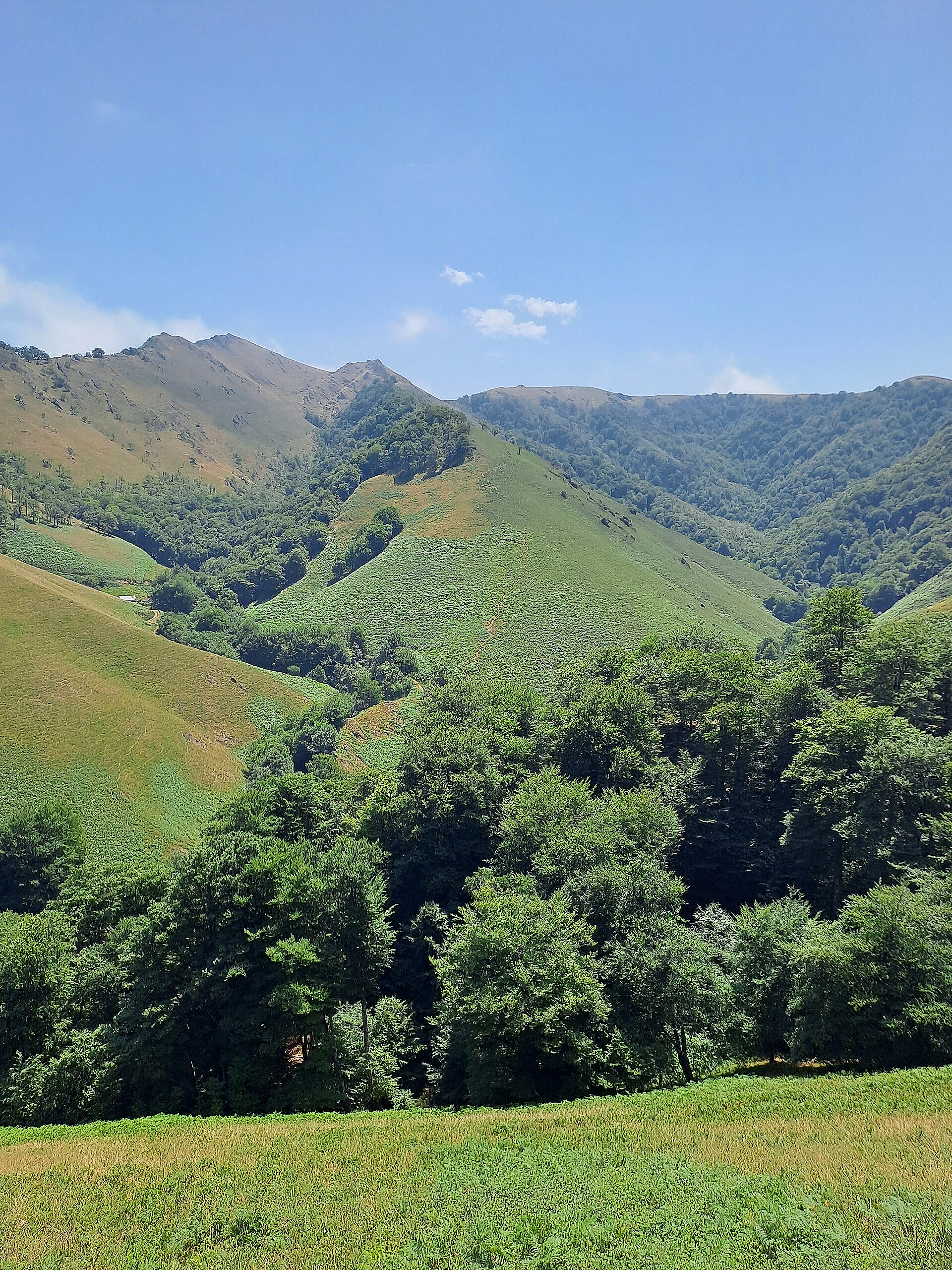 The steep road down and into Estérençuby was mirrored by an equally steep road up and out! Eventually a narrow path veered off the road and climbed towards Gîte d'étape Kaskoleta. I had considered stopping here in previous plans, but it was early and the weather was good, so I decided to go with last night's thinking and continue to try and make Sommet d'Occabé. So, with water filled I started up the ascent to a Col (820m) just below the summit of Ithurramburu (857m). Over the Col the trail followed a track down into the a valley ahead, a stunning view of the mountains ahead - Iraukotuturru (1151m), Arranohegi (1293m) and Arthaburu (1156m). It was towards Iraukotuturru that the GR10 was heading.