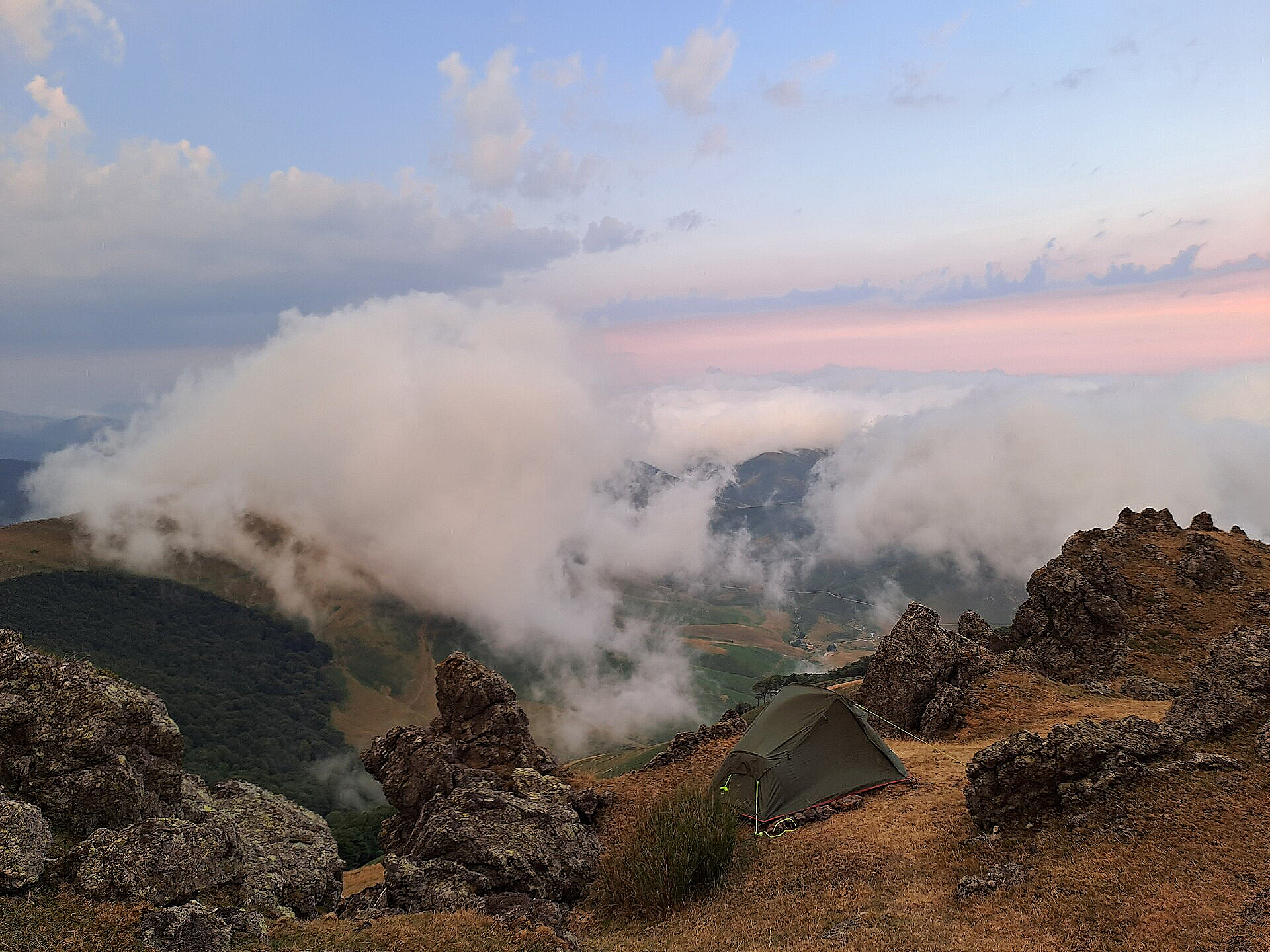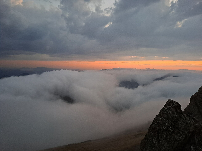 I found a little grassy 'nook' on the summit, surrounded by some rock outcrops with a great view so decided to pitch there. It was lovely and sunny and warm and wind free when I set up the tent, and I had a nice feed on another of those big tins of Cassoulet - I'm sure they're family size, or in my case dinner for one! Slowly there was a change in the weather, could sense a storm developing in more distant lower valleys, so I settled down into my home for the night to watch the flashes and rumbles to sunset. By the time sleep was taking over my being, no storm had passed over me but my sheltered nook wasn't so sheltered! It was more like a funnel drawing wind up and into it, and a chilly wind at that. I resolved that a cold night was ahead!