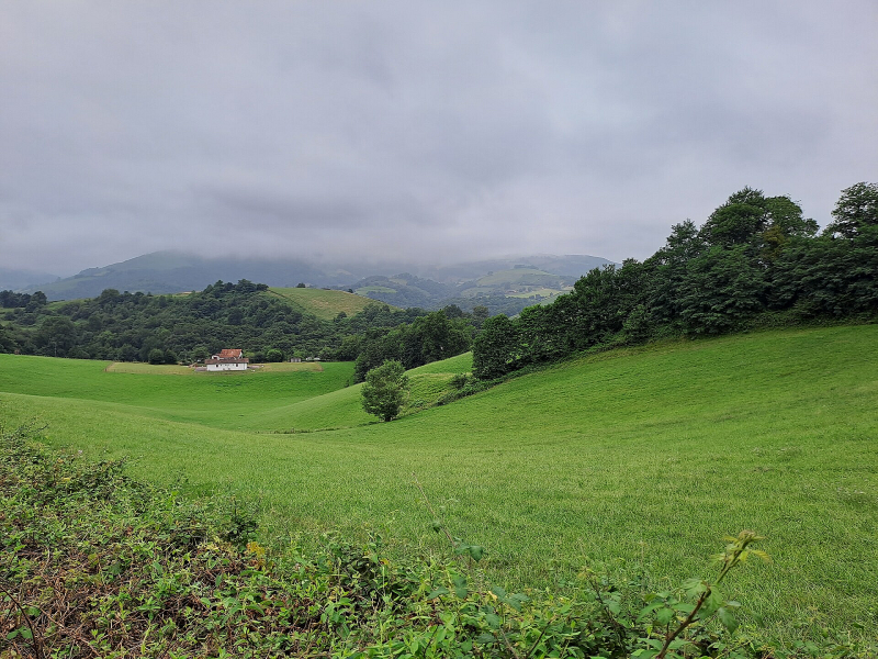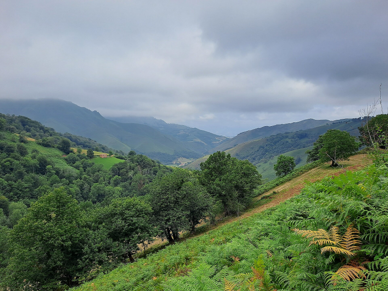 A bit more road walking and then the GR10 headed onto muddy paths through woods, and eventually into more open ground up the slopes of Gatarre (760m) as far as Col d'Handiague (587m). It was back to a small road after this, flat at first and then very steep switchbacks all the way down to Estérençuby (231m). Road walking sections must sound terrible and I'm sure some trekkers think so, but when they're just tiny roads with no traffic and stunning views I personally don't mind the variety.