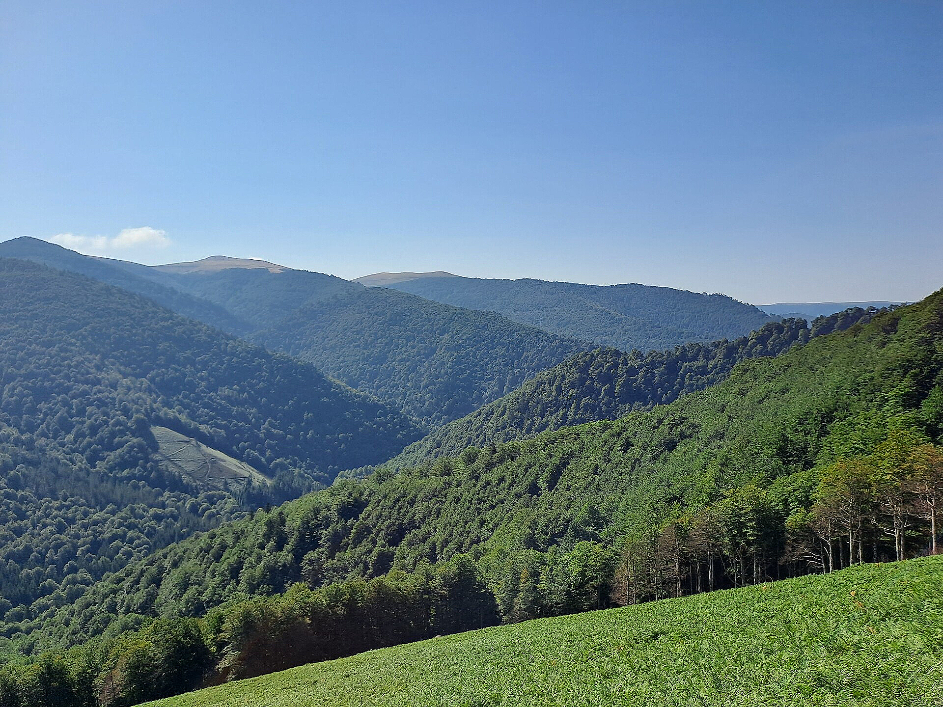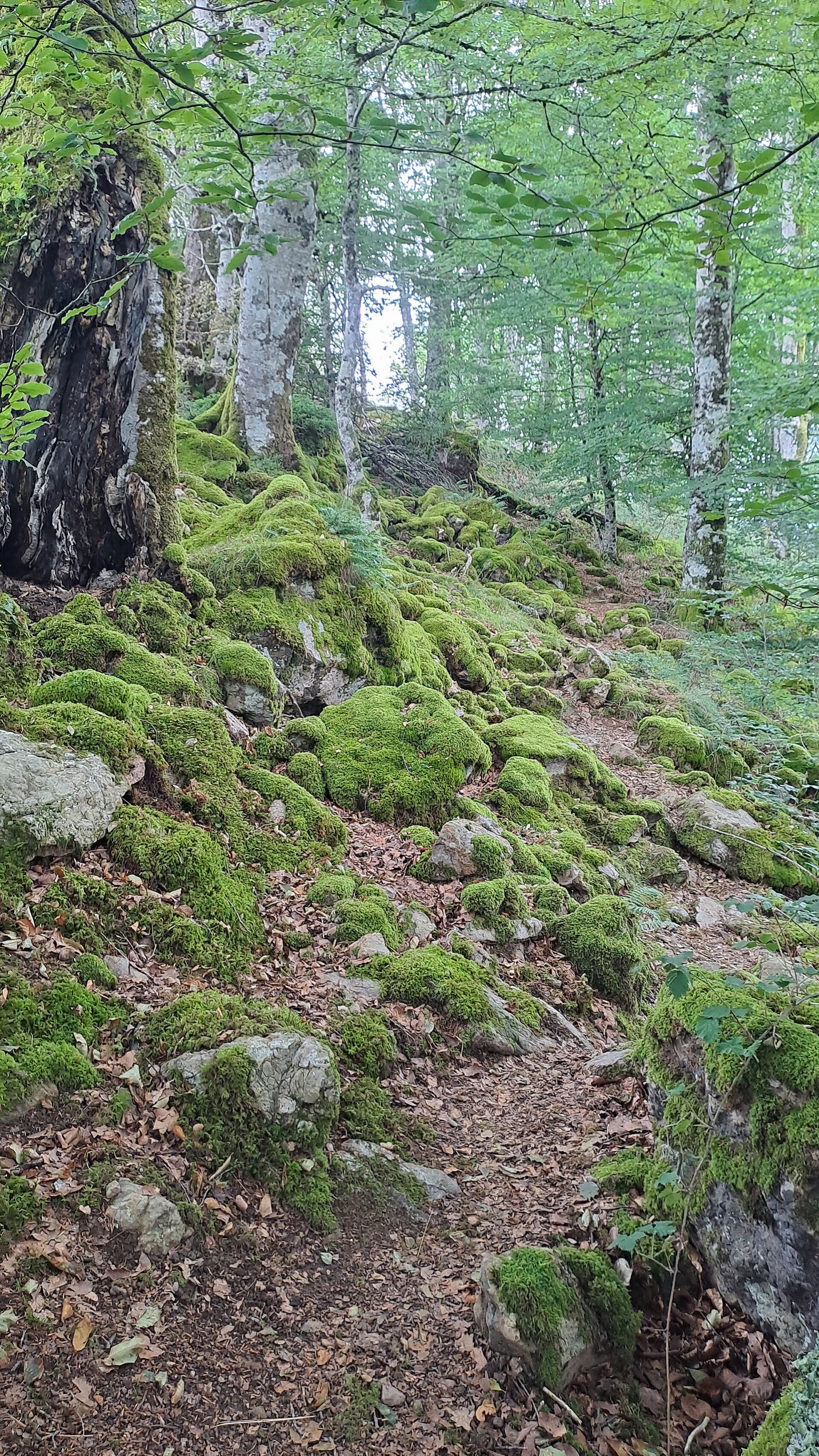 Refreshed, I headed off on the climb up to the Chalets d'Iraty complex, again this was predominantly through lovely woods with welcome shade in the strengthening sunshine. Just me and my thoughts. I find having the trail to yourself is such a beautiful privilege. Lots of rambling thoughts and meditations saw the climbing of Heguichouria (1348m) done quickly and the main building of the cross country ski complex come into sight. It had a nice little shop where I sourced a completely fruit based lunch, yum! Was able to refill water, and was quickly off again as I wanted to make the campsite I had reserved before leaving the UK at a reasonable time.