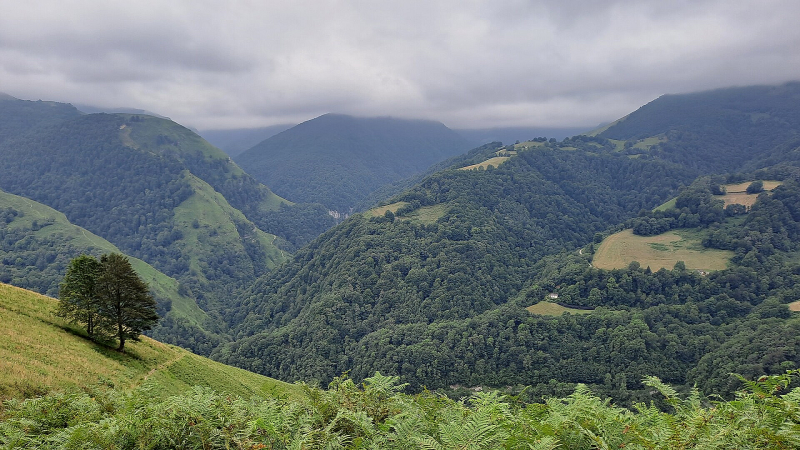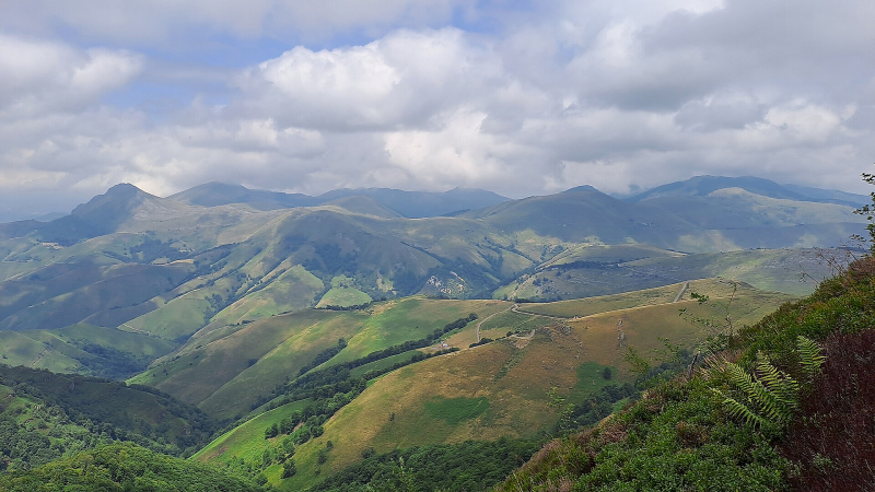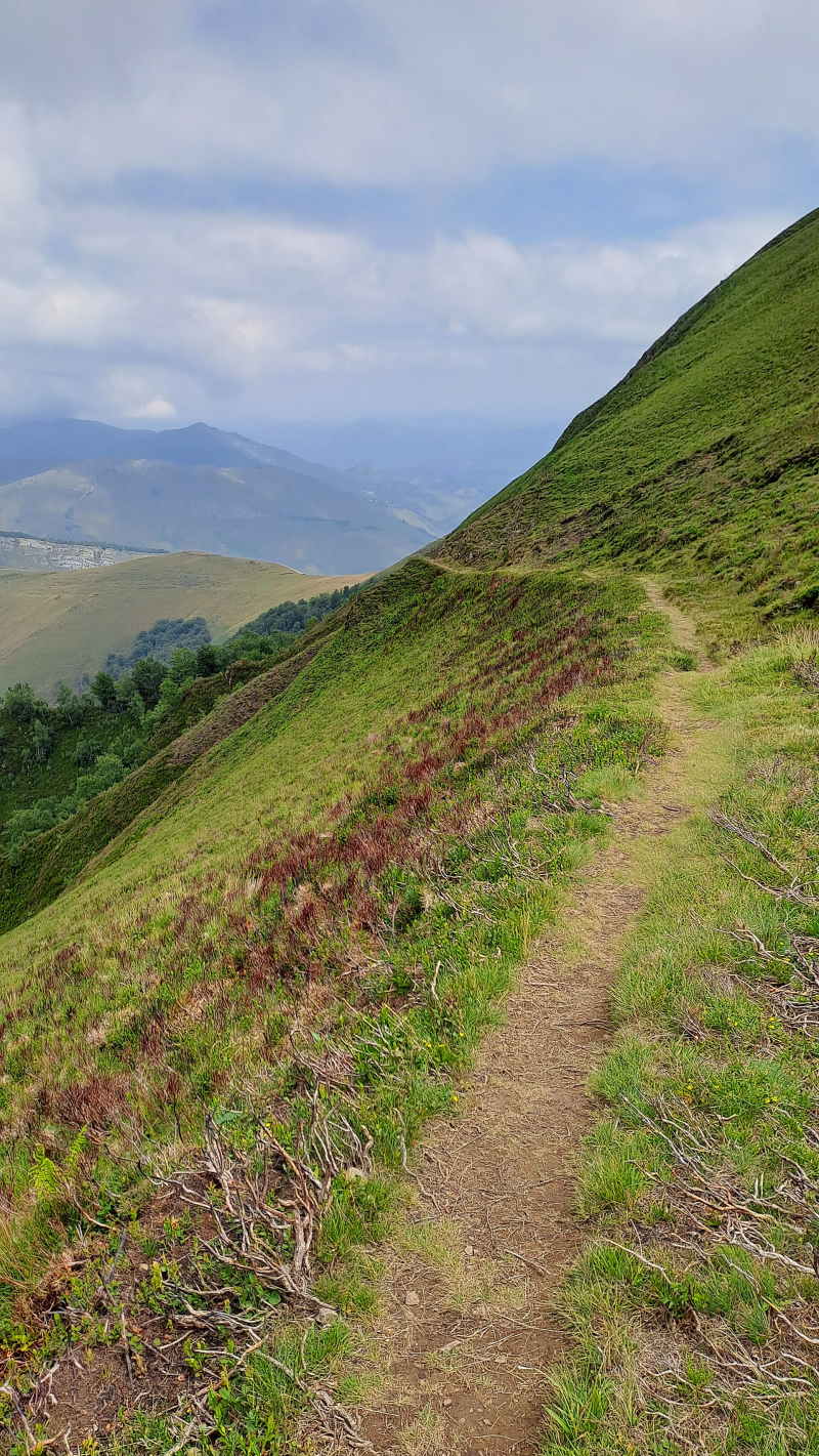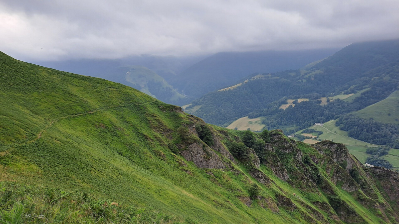 A short stretch of road led out of the Iraty complex and towards a climb, which I started after negotiating a herd of cows blocking my access! They don't care about trekkers when they're laid down chewing the cud! The short but steep climb was up the slopes of Pic des Escaliers (1472m) and the path crossed a Col at 1423m to then traverse the other side of Pic des Escaliers along steep cliffs. It was an impressive section offering pretty spectacular views. The rest of the afternoon's trekking was along narrow paths cutting into the steep sides of Belozkarre (1173m) and Hurdesparri (1006m). The geology seemed to be a blend of lush green slopes and increasingly steep and rugged terrain. Not that there hasn't been ruggedness so far, but just a sense of change as the Hautes-Pyrenees section gets closer. The path wound in and out of the mountainsides with a long series of ups and downs, until the final and very steep descent to Auberge Logibar. Felt brutal to the feet and legs - well, brutal to me when it was kms 29 and 30 probably!