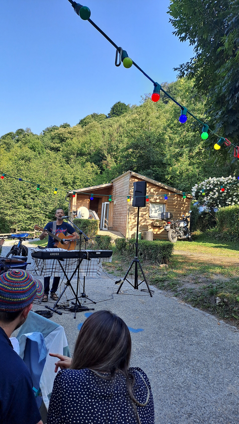 Late afternoon called for another café au lait down at the bar/café area. I did a bit of forward planning with my guidebook and was about to leave when it seemed something was bring set up. This soon turned out to be a music event, so I hung around and was joined by a couple and their 7 month old who I'd chatted to briefly earlier. Again, lovely people, a German lady and a Luxembourgian man who live in Nantes holidaying for a week. The music got going with the campsite custodian getting his guitar out and singing an amazing little set of local music through to Johnny Cash numbers! Then the main guy took over with more live music whilst most of the campsite and some locals gathered at tables and on lawns. Really cool. There was quite a lot of alcohol being enjoyed as it should be, so I took myself off for a bit to have dinner up at my tent terrace. I could still listen to the music which was great, and I kept thinking throughout my dinner how much I'd enjoyed and was enjoying my campsite break.
