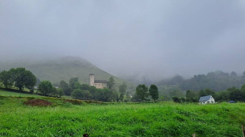 There had been zero camping opportunities and the weather was a concern, there was a light rain in the BROUILLARD which was OK but I didn't want to pitch in heavier rain. So I continued on to the tiny and picturesque Sainte-Engrâce (630m) where you can camp at Gites Burguburu.
