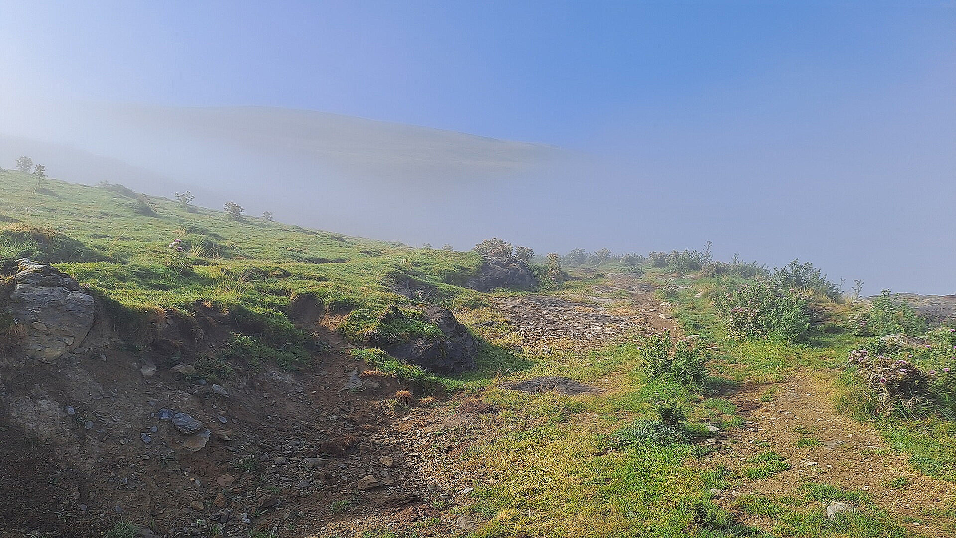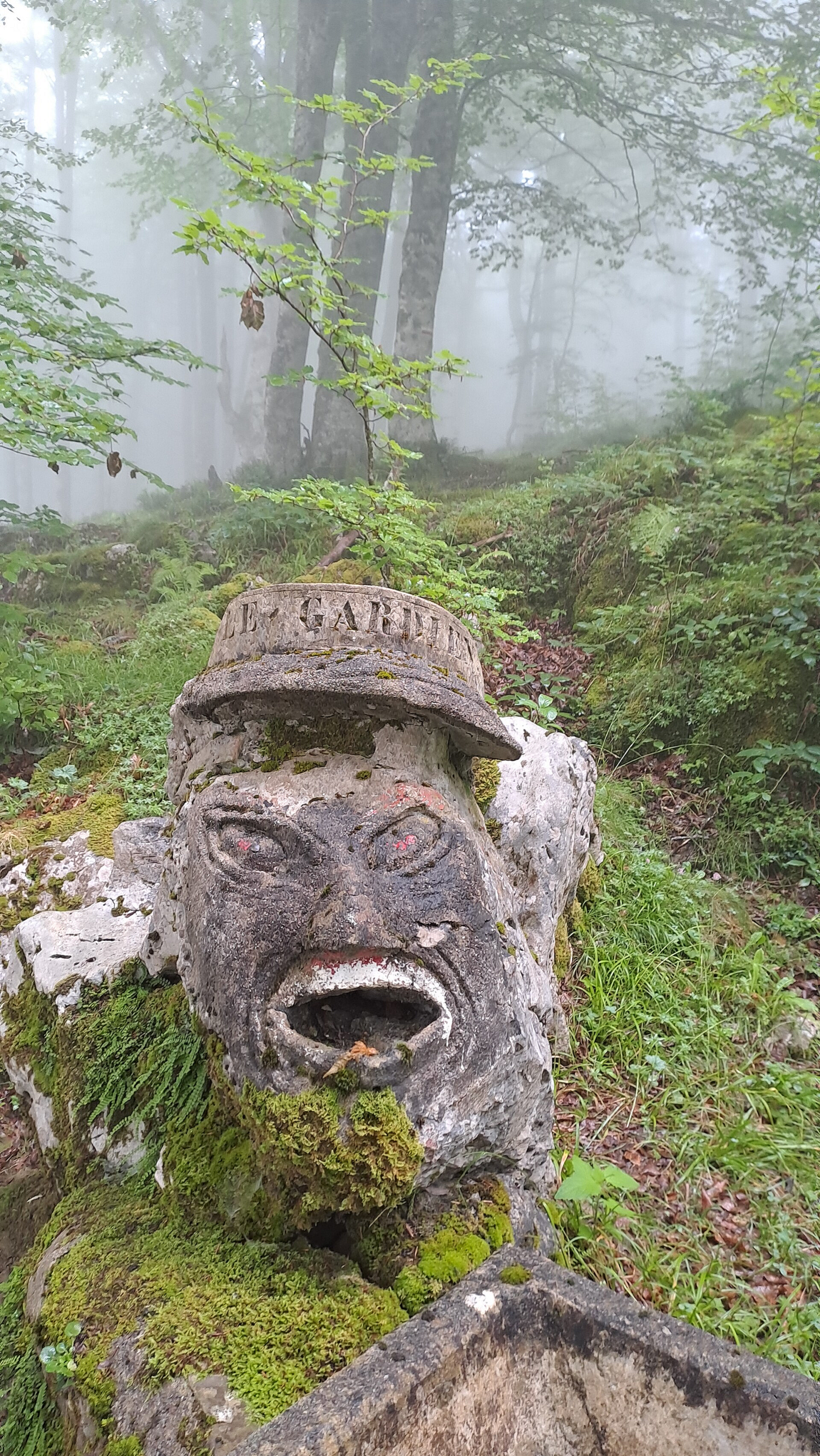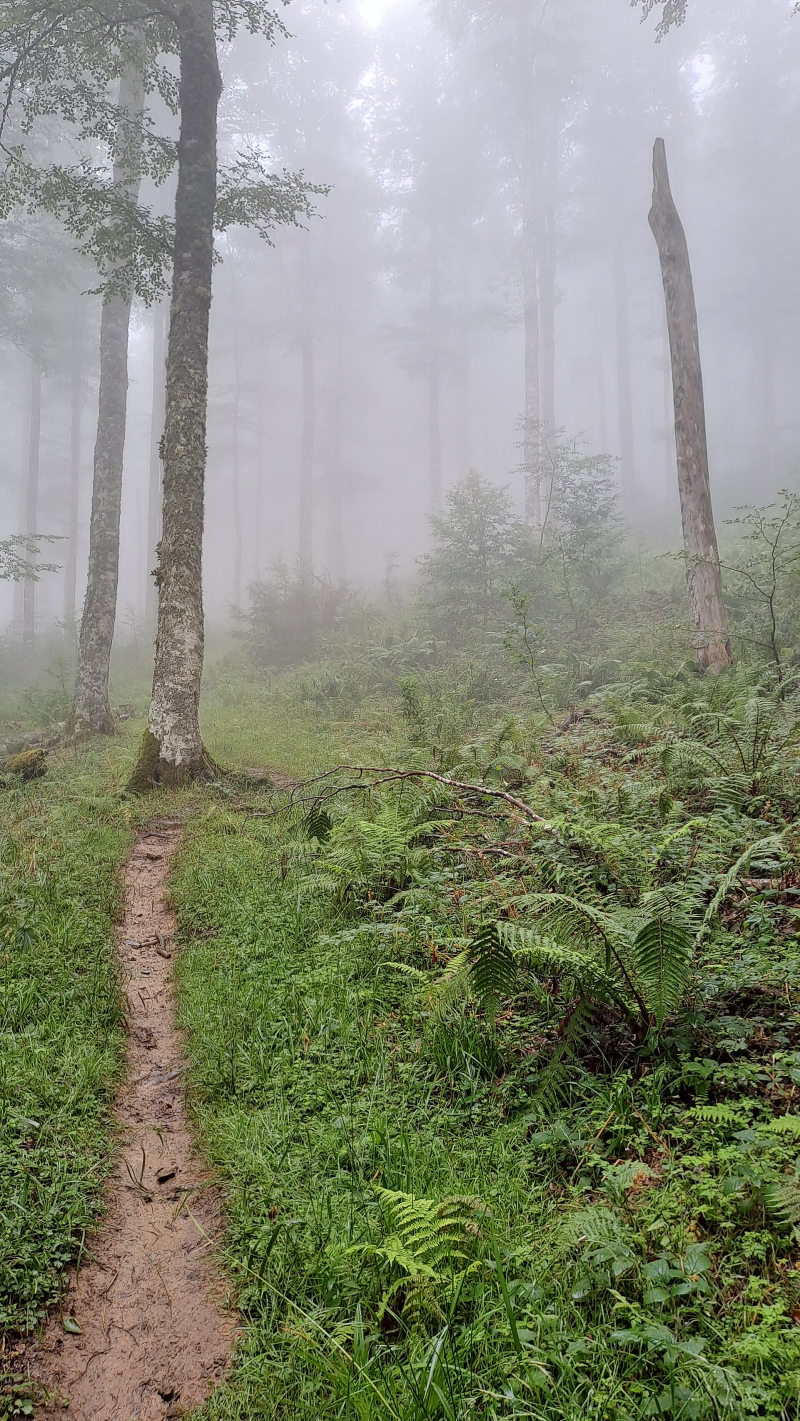 Wanting to warm up and try see if sunshine was at higher altitude I set off at a good pace up the steep, wooded climb. There were many tight switchbacks and it was enjoyable despite the still very wet and foggy atmosphere! Even when I exited the woods and the climb became less steep, the damn fog persisted! I had been past the strange 'Le Gardien' carving in the forest and swore at it regards the blooming BROUILLARD!!
