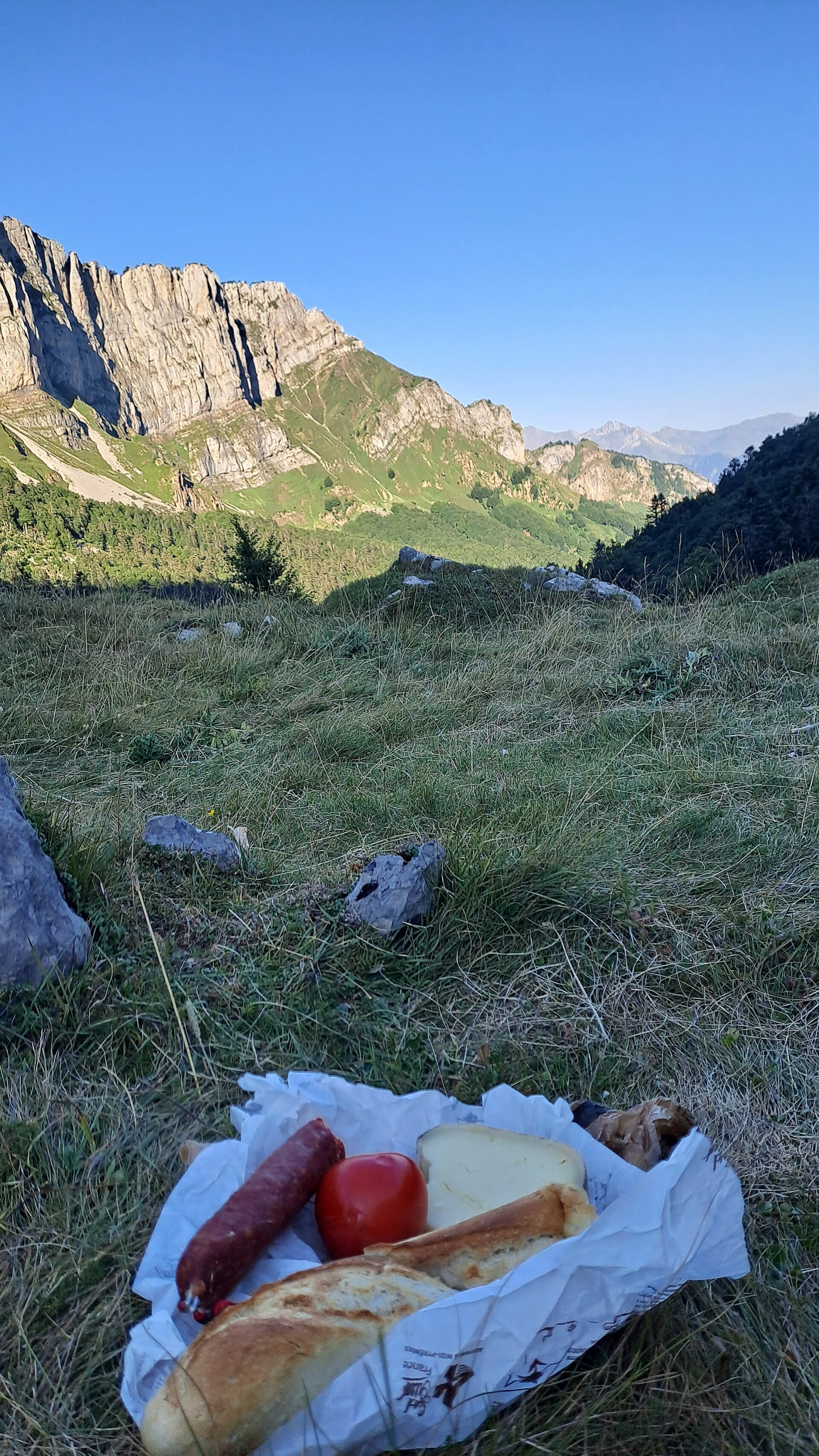 It wasn't long before I was considering sitting down for dinner that the Berger from Cabane d'Ardinet passed by after herding his sheep. It was actually a whole family affair, his wife son and daughter had been out with him. He was very friendly and reassured me he has excellent spring water at his Cabane. Dinner was classic mountain fare - the mountain sheep cheese I'd bought, chorizo, baguette and tomato! Mmmmm, mmmm! What a day! From bee hive pandemonium to my what seemed like my own perfect and peaceful valley for the night!