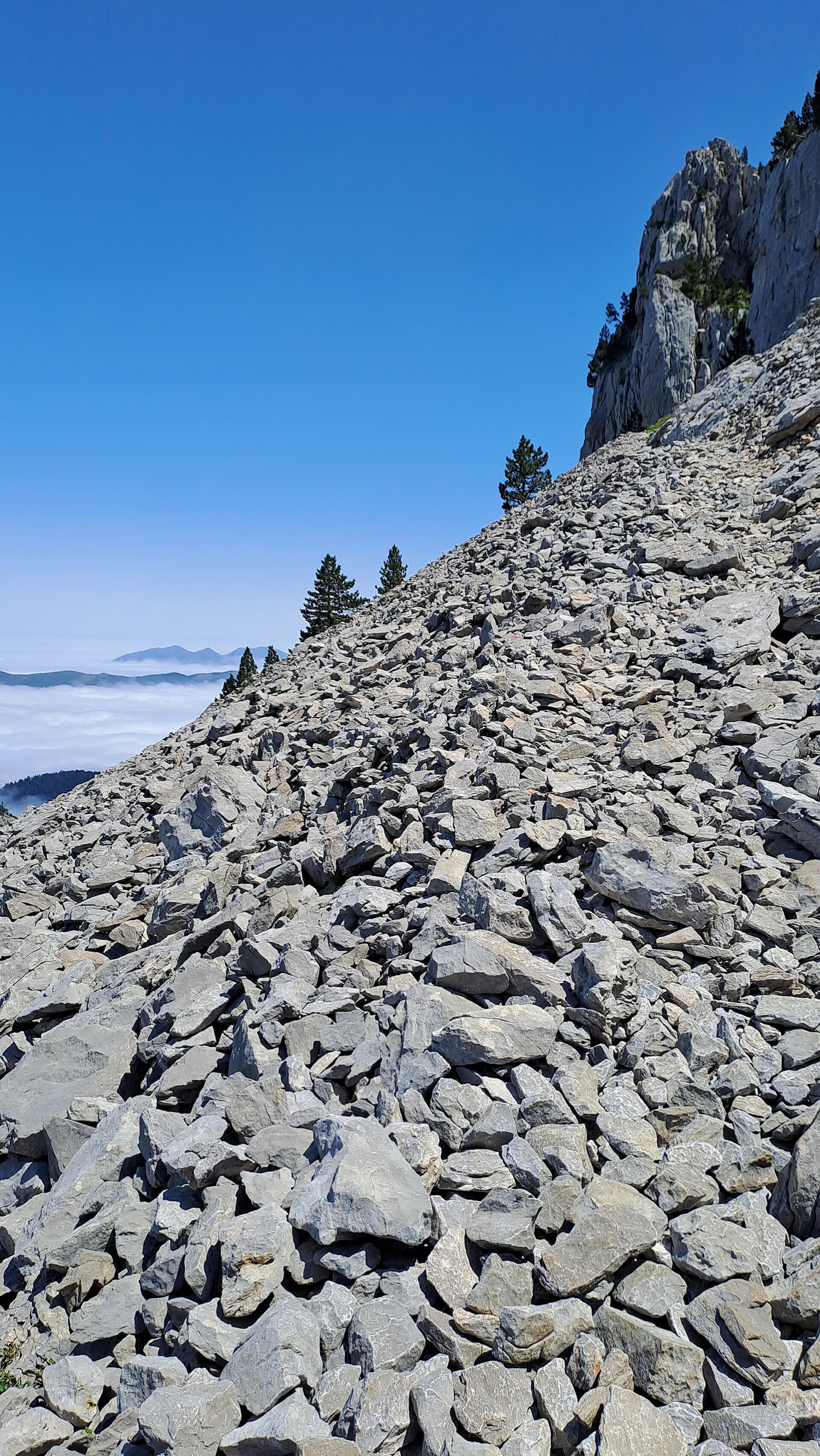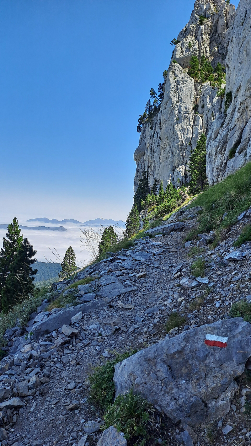A bit of track saw me up above the ski resort and into the ski lifts, it looked like it would be a good place to ski! The track soon veered onto narrow path which climbed through very rocky terrain and utterly breathtaking views! The sky was blue, the temperature lovely, the cloud below provided for a sense of being above the damn BROUILLARD! Craig was an extremely happy man!