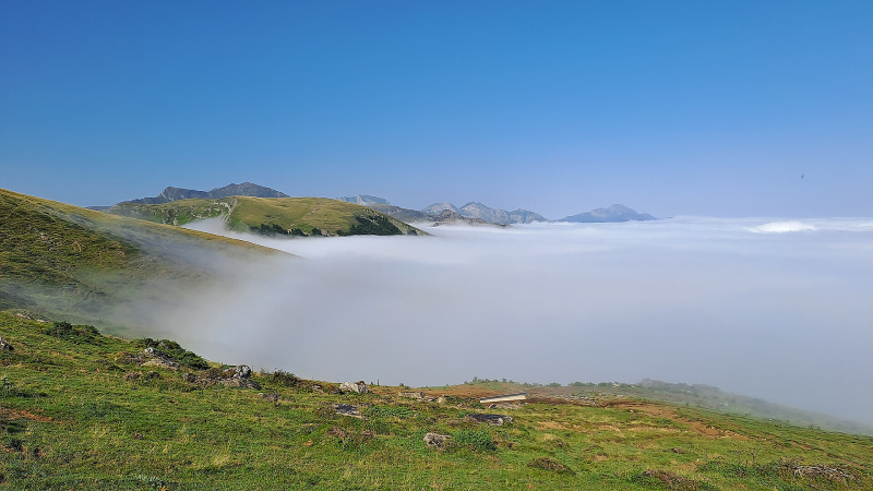 Coming up and out of Arette-la-Pierre-St-Martin, the path skirted Pic d'Arlas (2044m) before following a spectacular traverse with Portillo de Arriba (2105m), Le Pourtet (2238m), Pic d'Anie (2504m) and Pic de Countendé (2338m) dominating the skyline to my right. To my left was the cloud filling the valleys far below.