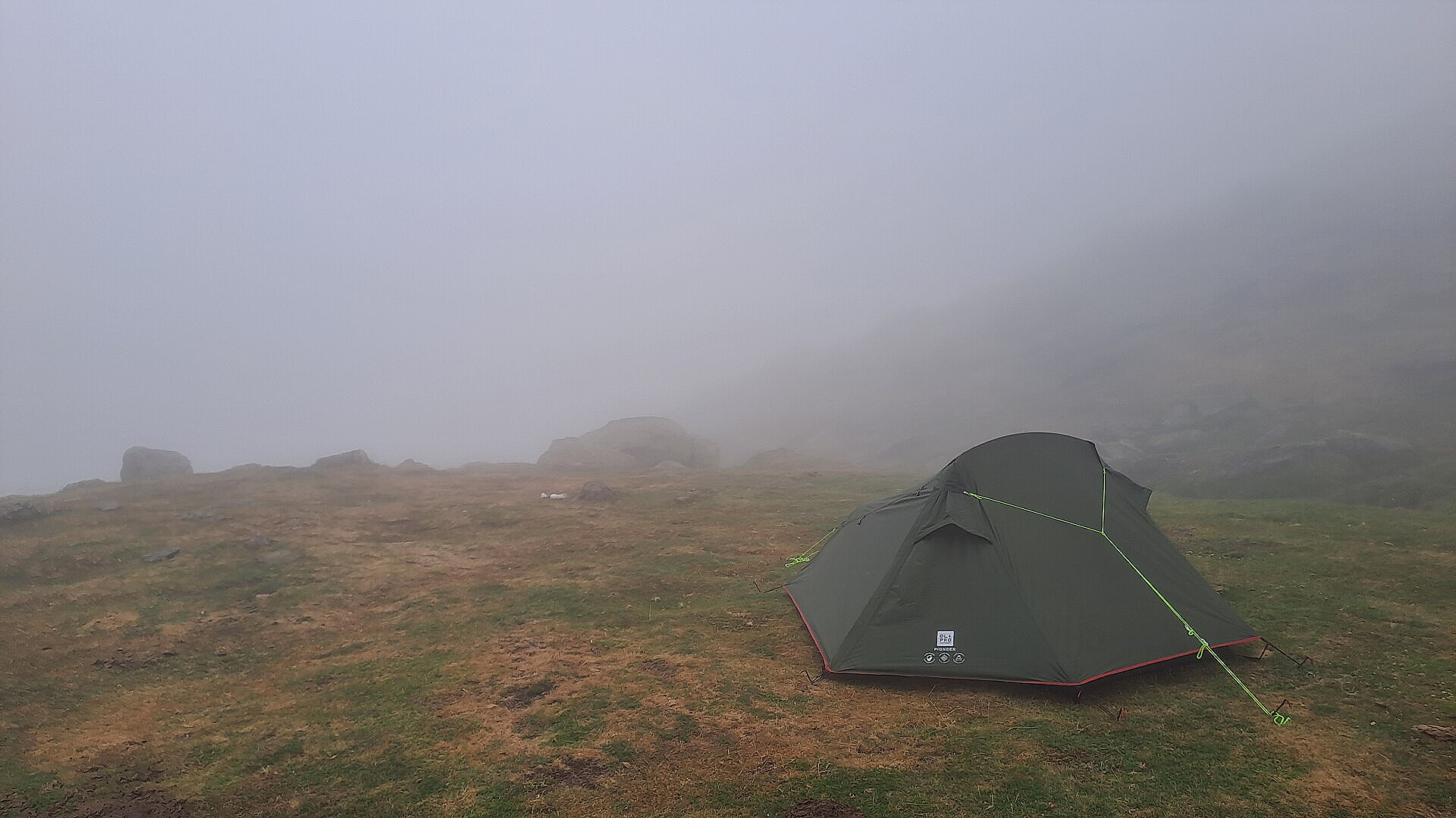 It wasn't pleasant putting the wet tent up in chilly mist, but I hoped let the light breeze might dry it. The temperature was dropping quickly so had a quick 'mud & dust' lower leg wash in the tiny stream nearby, and got straight into my sleeping bag to keep warm and read my kindle book - yes, I'm actually reading a book, amazing really! A couple of hikers went by on way up to the Refuge d'Ayous which then left me alone in the cloud covered corrie with the mountain horse neck bells keeping me company. I assume their occasional neighing was communication in the poor visibility?! Anyhow, they were my friends for the night and maybe we'd all have a clear view of the surrounding beauty come morning?
