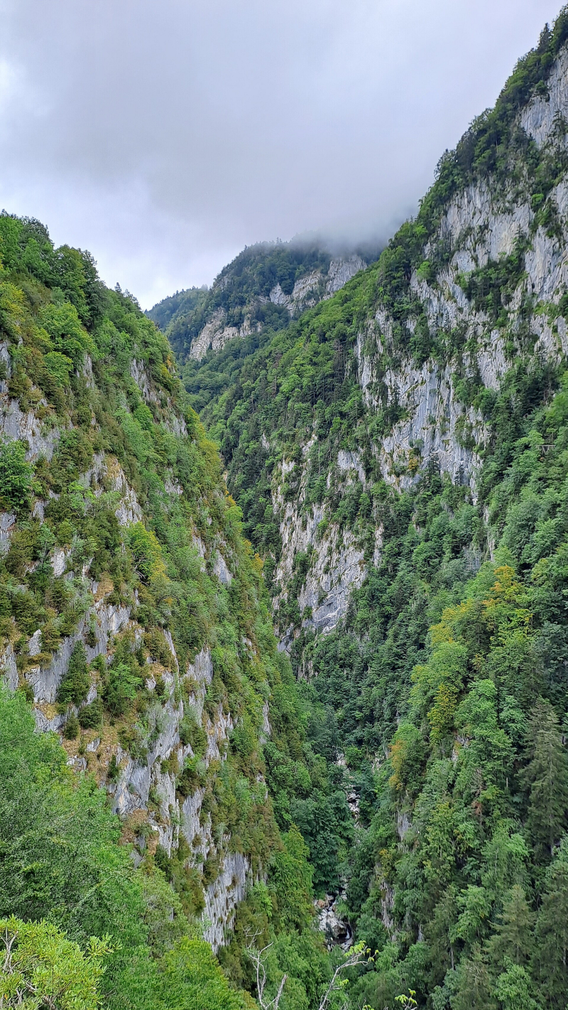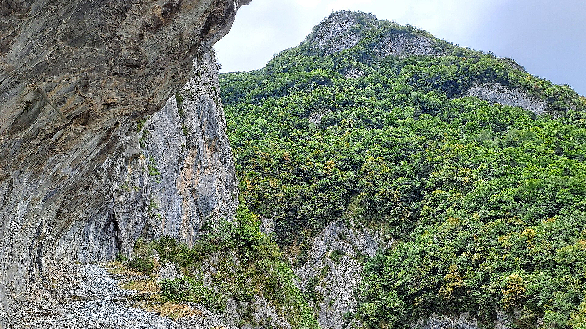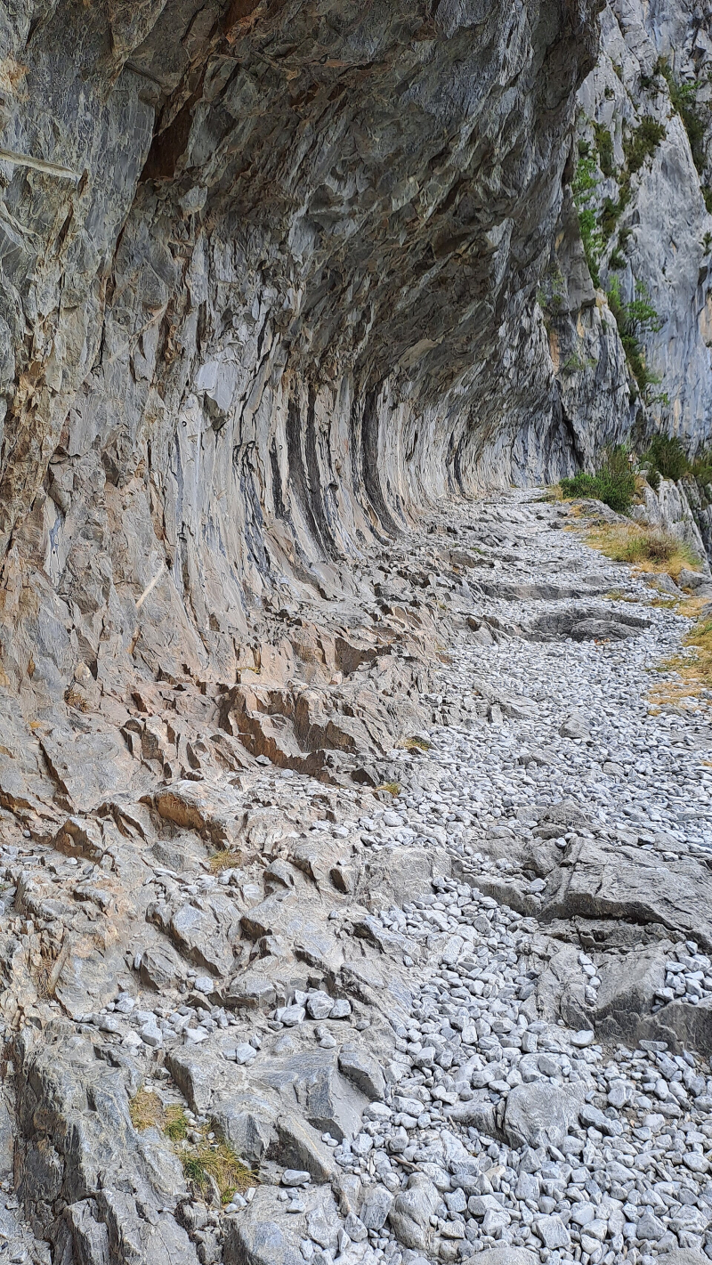 All refreshed after my café au laits, I started out of Estaut along the road to the start of the long climb up towards Col d'Ayous. Whilst munching on my delicious, nutritious trail mix I was looking forward to seeing what the Chemin de la Mâture was like, a feature of the start of the climb, and it didn't disappoint. It is an amazing path that was cut into near vertical limestone cliffs in the 17th Century to extract wood for the vast French Navy of Louis XIV (I looked that up!). It's fairly wide as I think specially made carts were used on it, and has a concave side, so no vertigo issues! There were two nutcases in my opinion, rigging up the abseil the sheer vertical drop - not for me! Whilst trekking up it, I found it incredible to try imagining it being carved out all that time ago! But, I was grateful for the very hard work put in because it provided one heck of a stunning climb high up one side of the Sescoué ravine, with the sound and sight of the Cours du Gave d'Aspe flowing far down below!
