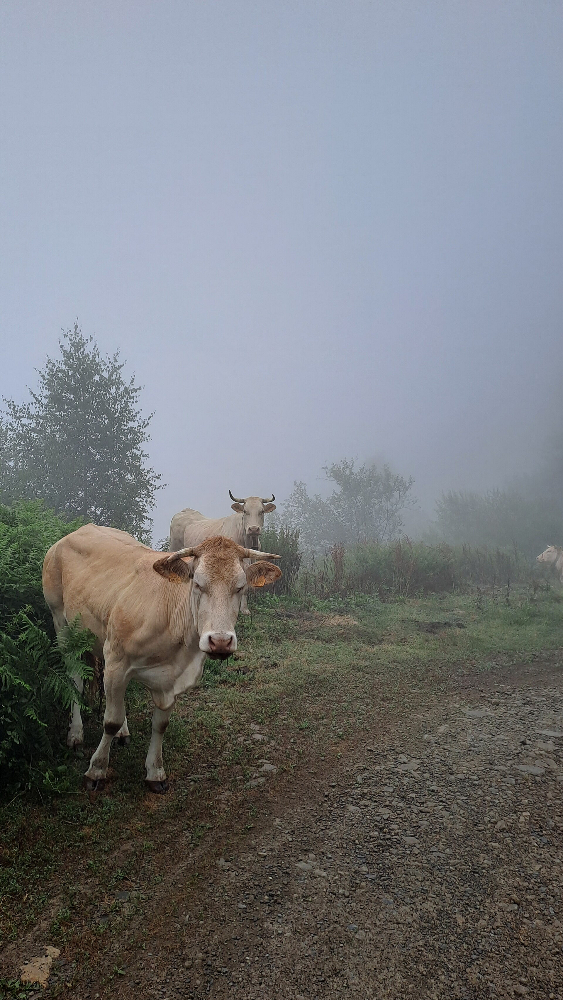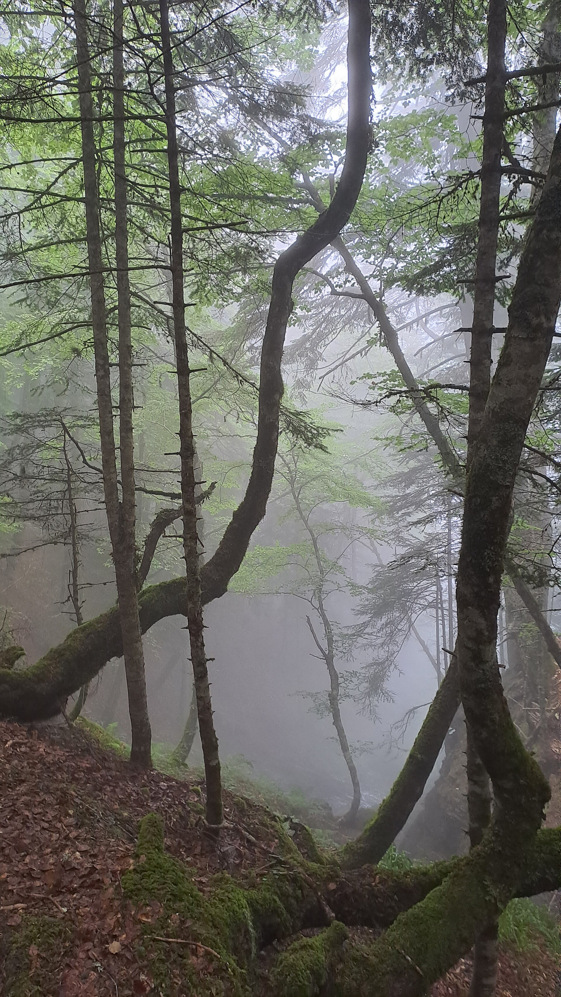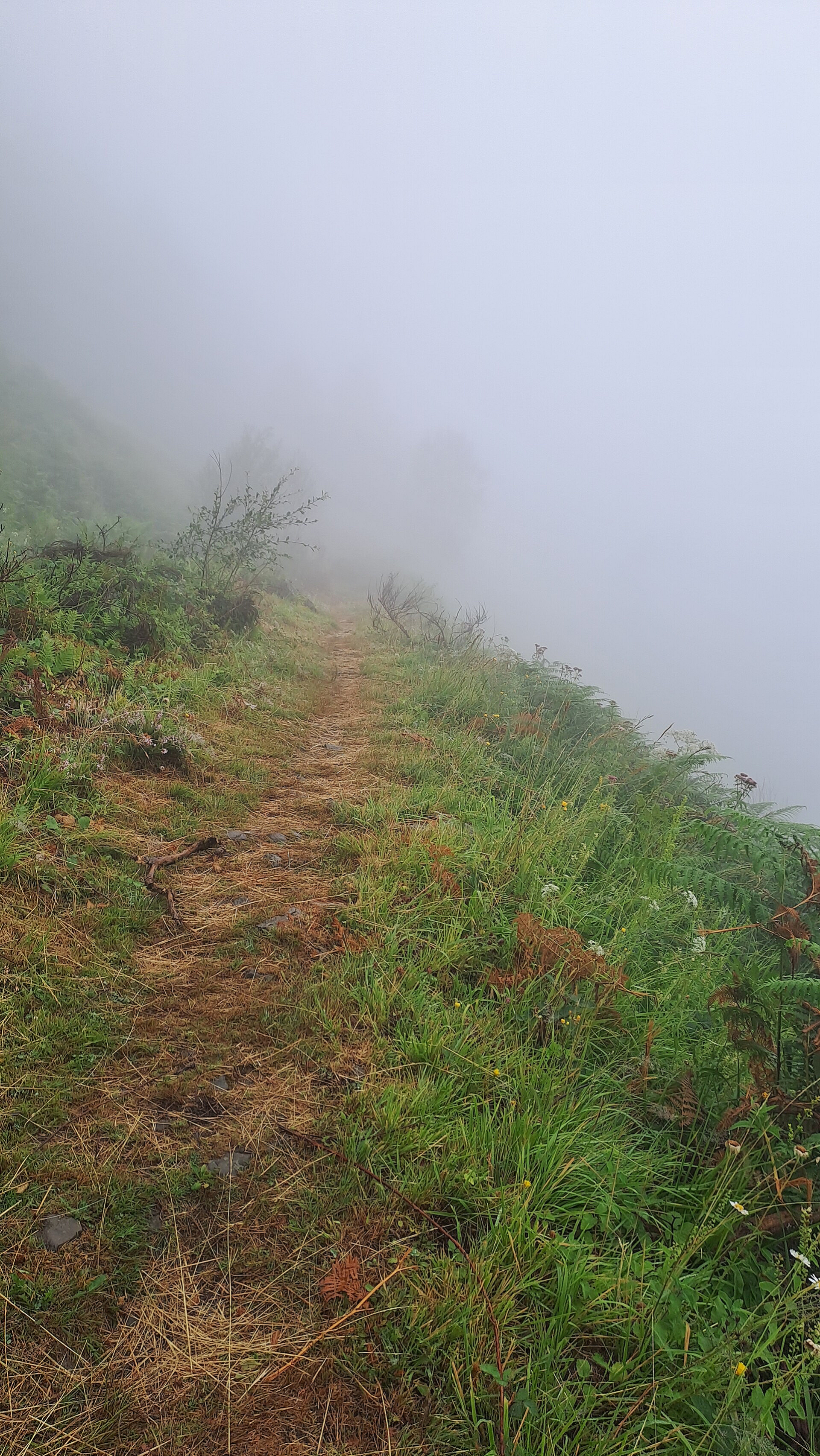 Turns out it was the perfect energy boost as the steep climb passed by pleasantly. I love endurance fitness, and how the body adapts when repetitive demands are put on it. I felt strong at the steady pace I've settled into on climbs. The terrain was dry despite the wet air and the fog (or was it cloud?!) that I was in, so unfortunately there were no long distance views. However, the climb was mostly in pine trees, followed by other trees I am unable to name, which made actually made it quite atmospheric being hemmed in by the white beyond the trees! It was a lovely narrow path with switchbacks all the way to Col de Barrancq (1601m). This is the Col between Le Tuquet and Pic de Labigouer (2175m).