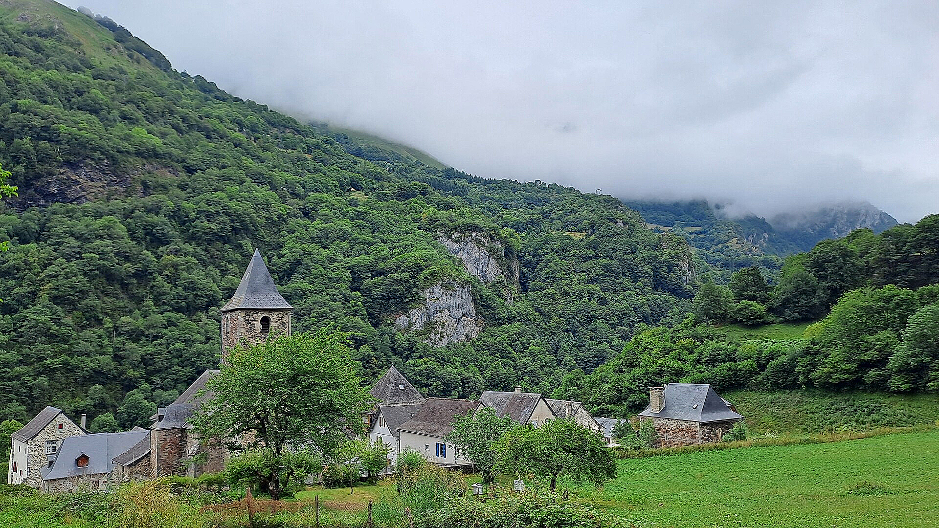 The descent started immediately! Heather covered slopes at first, before a forested zone, followed by fern clad slopes. I was still in the fog (or cloud!), which I found frustrating as out in the open path I knew there were great views across to other mountains, and down into the valley where my destination village Borce was situated. On the descent I passed a fair few people coming up the other way, first person being a lady in probably her late 50's, trekking happily alone. A cursory solo trekkers nod and 'Bonjour' was all that we exchanged! A mutual understanding of the love of experiencing the trail to yourself I think! Either that or maybe I look well dodgy?! I saw the couple with their donkey having a snack - the donkey snacking on grass, the people snacking on what looked like nice provisions way healthier than chocolate biscuits! About 800m into the around 1000m of descent the villages of Borce and Estaut came into view as the white stuff cleared a bit. It was a really attractive view of the two villages down in the valley, surrounded by imposing tree covered mountains, whose full sizes were concealed by the cloud hanging over their peaks and over part of their tree clad lower sides.