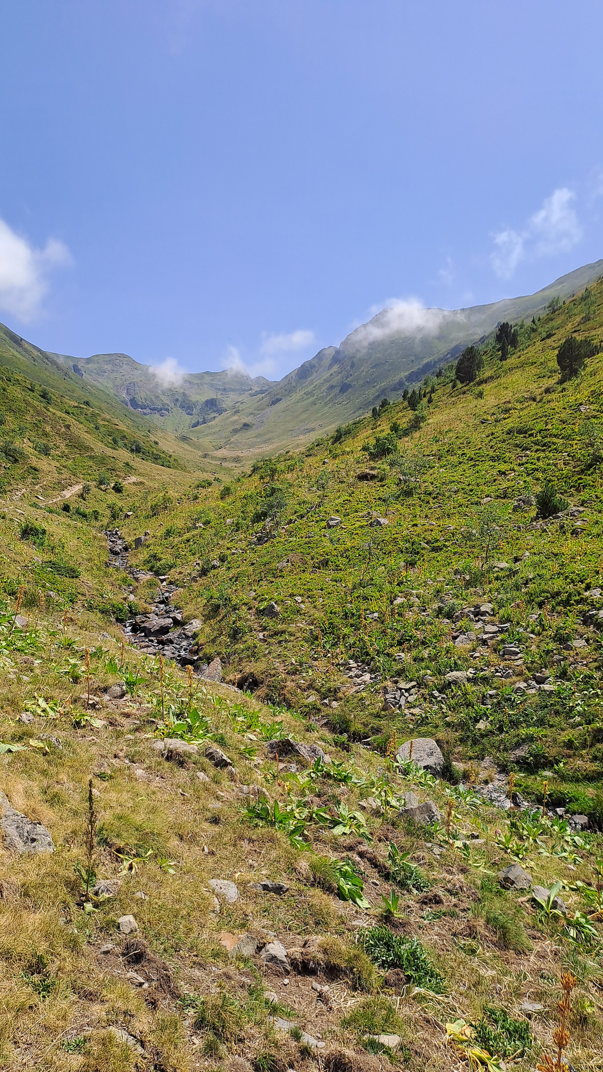 Not far below the Cabane de la Baight de St-Cours the view opened up to reveal an amazing view of Pic d'Ayous (2288m), Pic de Larry (2341m) and 'a peak I'm unsure of the name of but I think is Hourquette de Larry' (2208m)! These mountains dominated the skyline ahead and provided an impressive target to trek towards. At the Berger's cabin (Baight de St-Cours), there was a spring fed pipe trickling with water, so I downed the treated water I had and refilled with fresh spring water. I wanted good hydration as if I found a nice wild camp before Col d'Ayous I wasn't sure of water availability. I greeted the Berger with my best cordial bonjour, however his gaze didn't shift from wherever he was staring to whilst toking on his his roll-up! I moved on quickly and cool as a cucumber, as if nothing had happened!