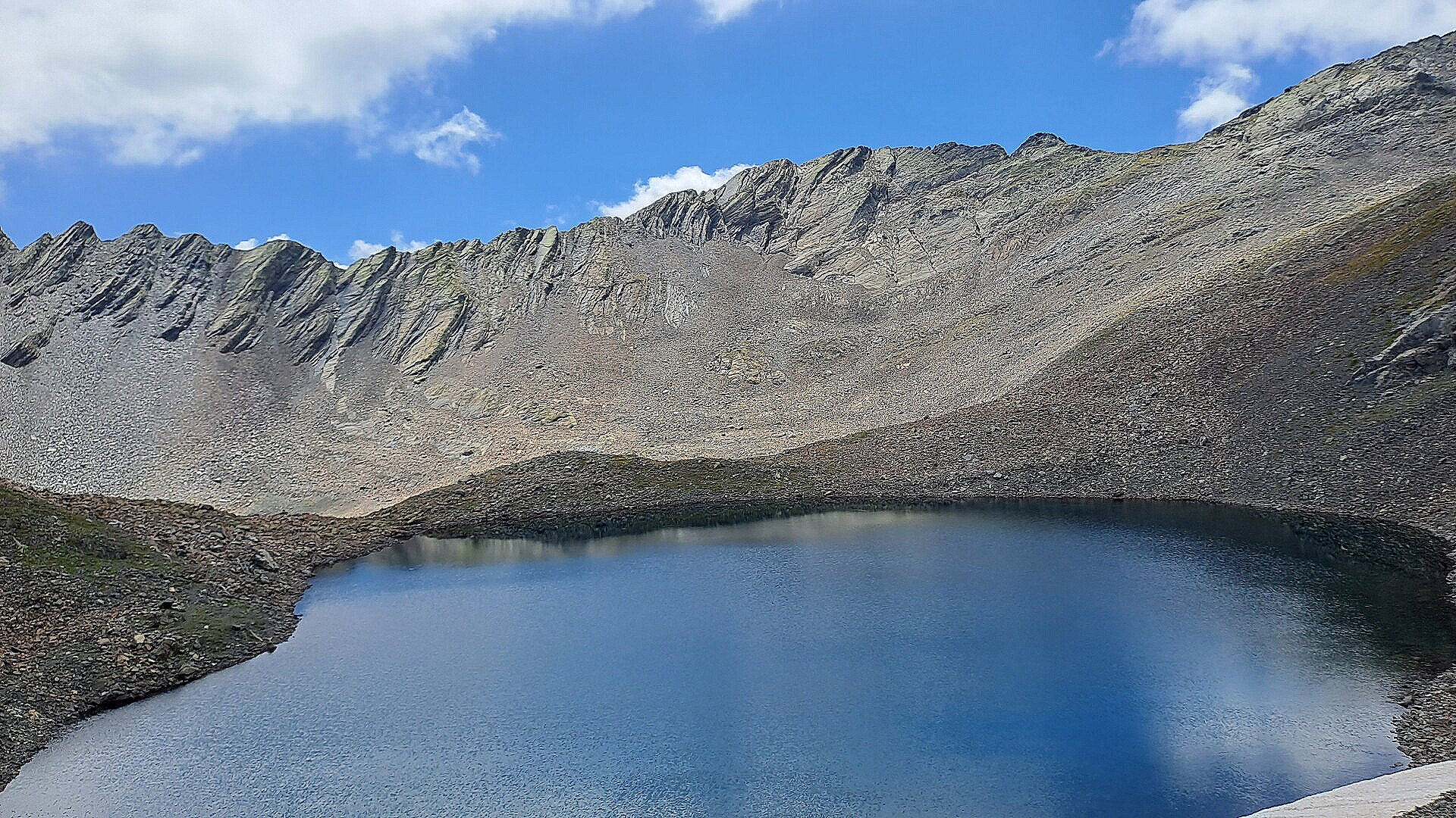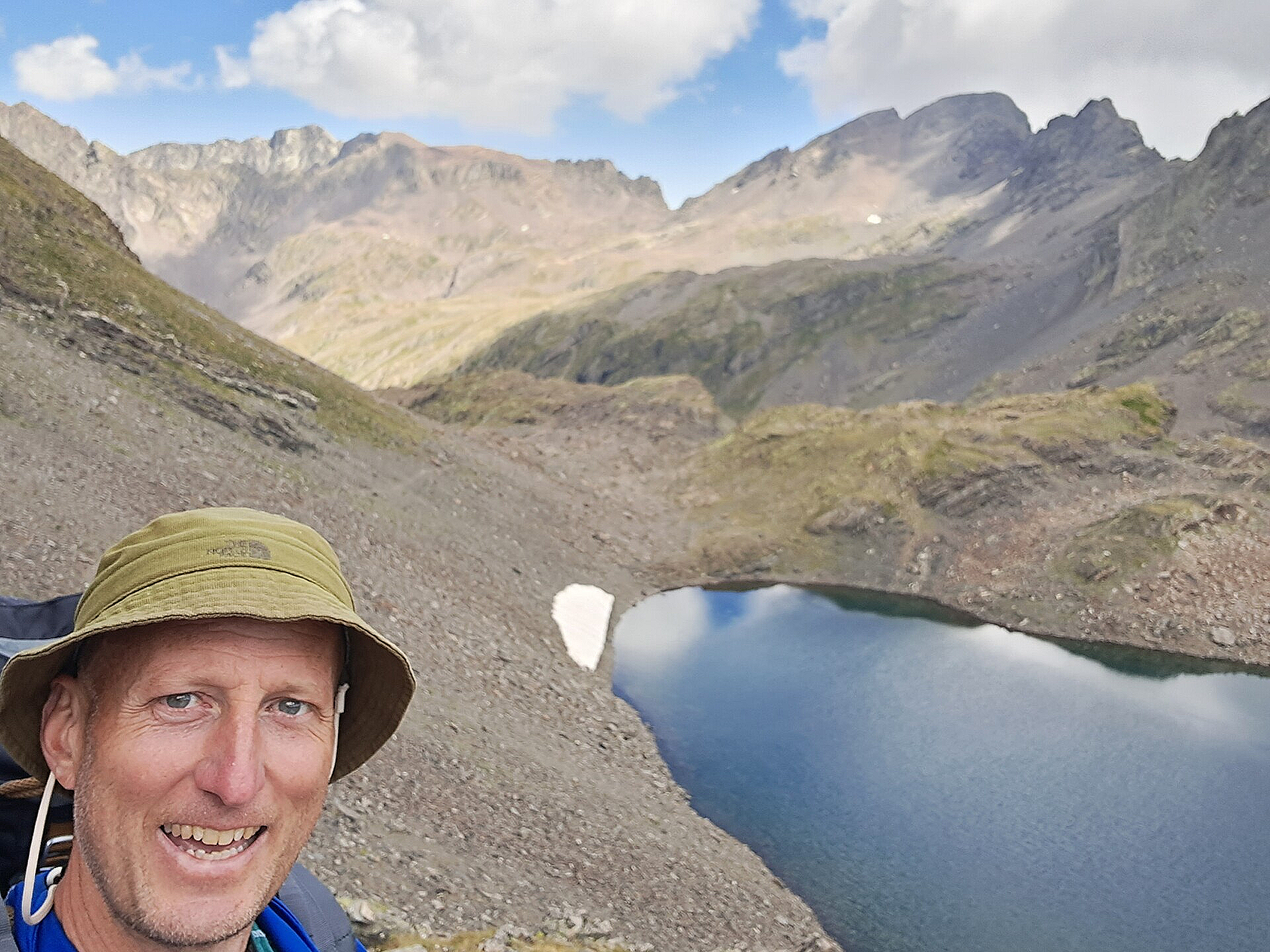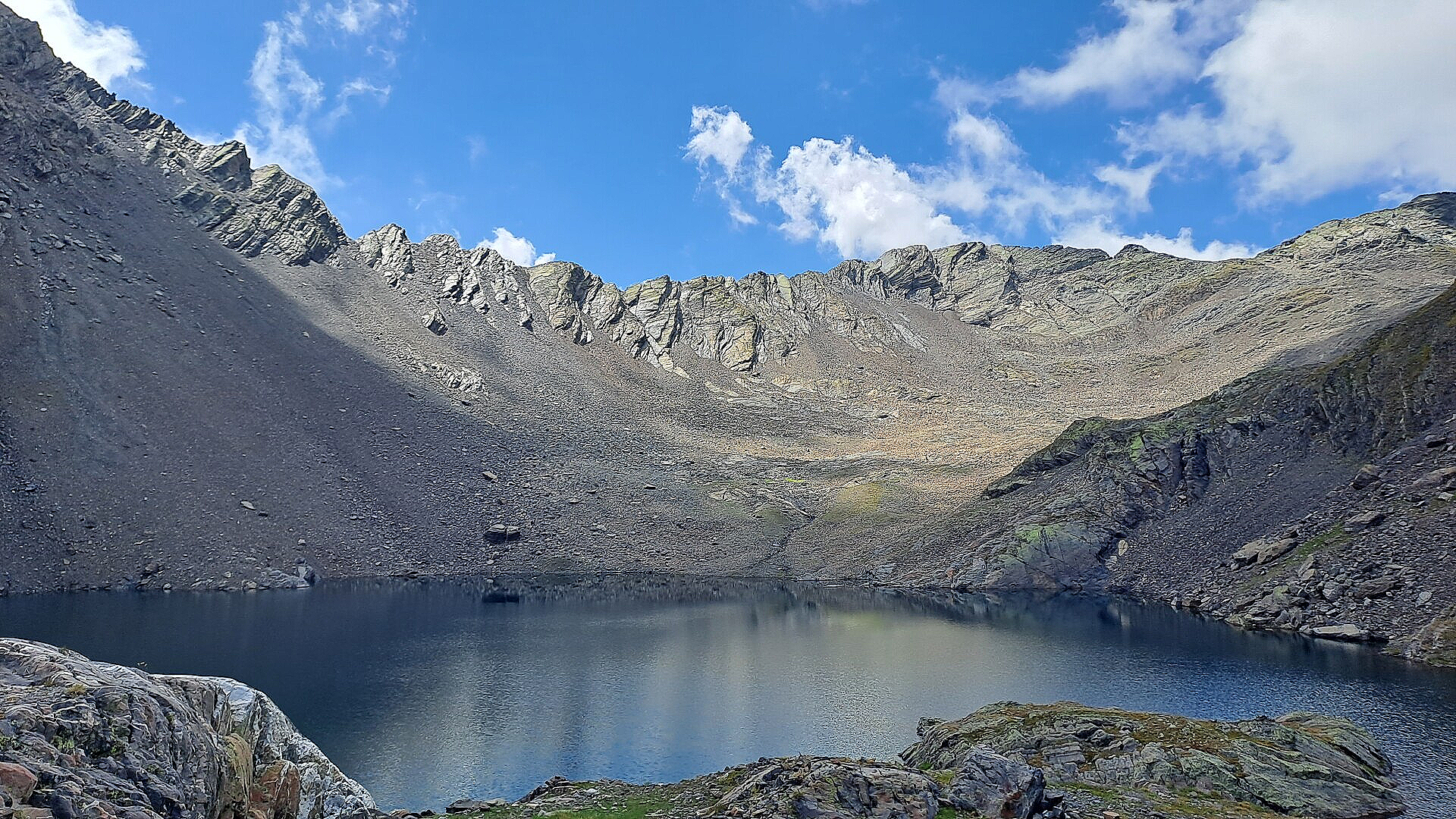 The fourth lake, Lac Glacé (2580m), was situated in the most amazing surroundings of shiny rock cliffs, I want to say slate, but I have no idea! But they were wildly impressive, a deep and shiny grey it seemed. The feeling of excited loneliness was as awe inspiring as the views of the lake in this wild landscape!