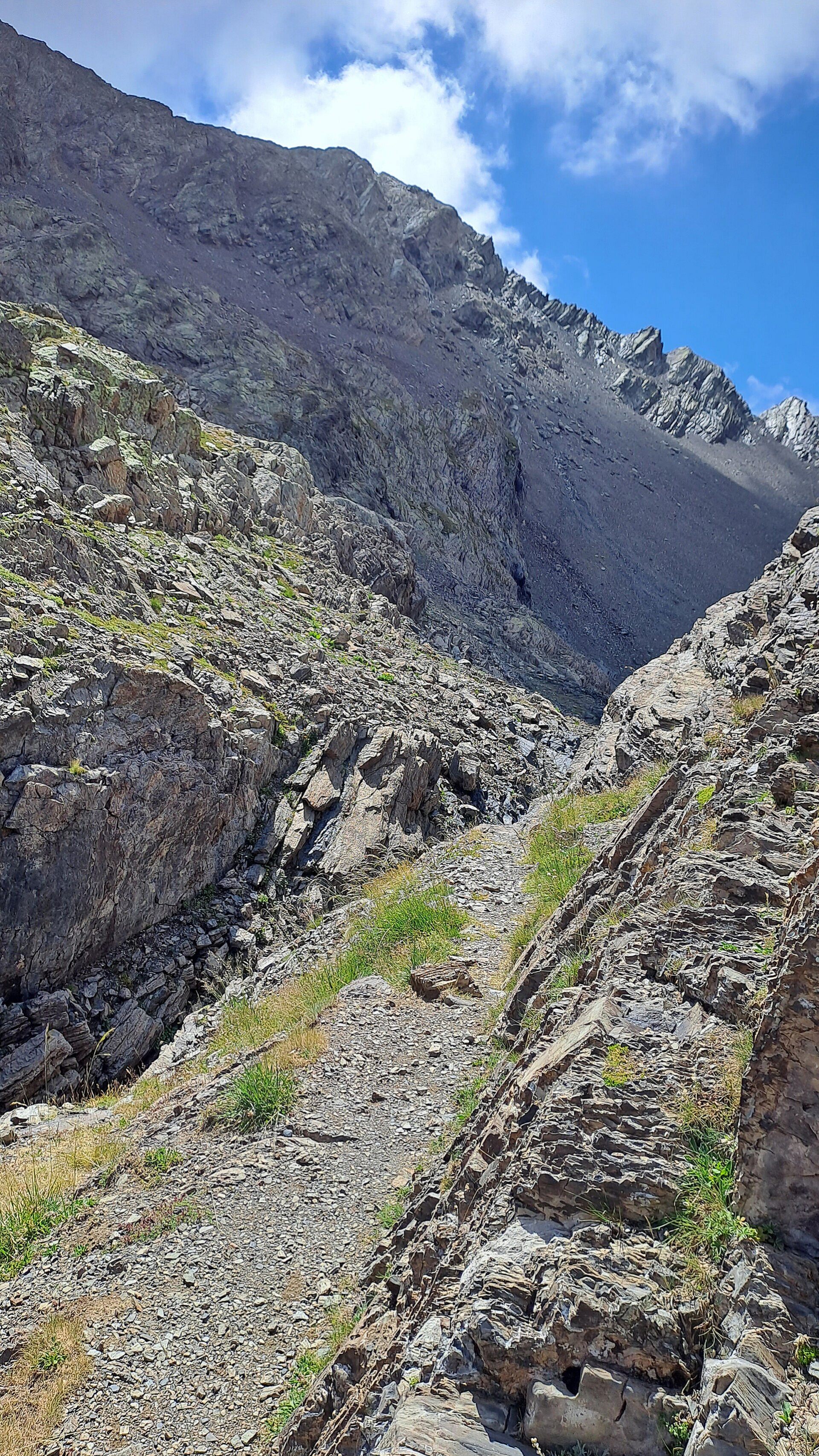 The path of the route I was taking climbed steeply again, switchbacking up Pic de la Sède (2976m) and then traversing across Pic de Labas (2946m) towards the lakes at the start of my day's route.