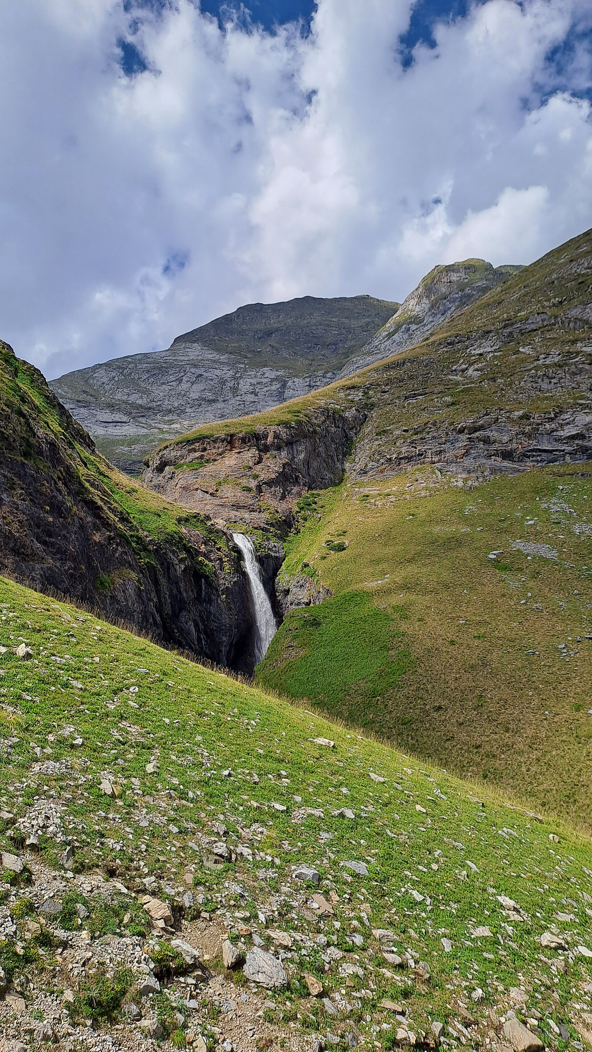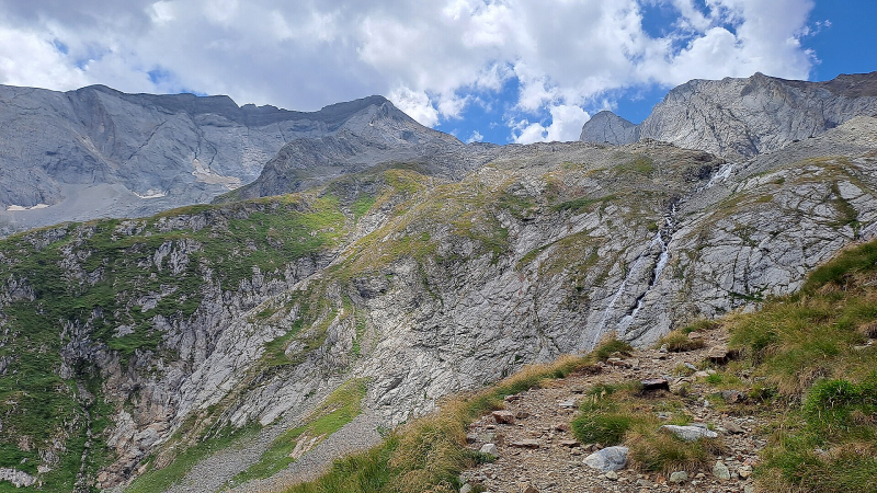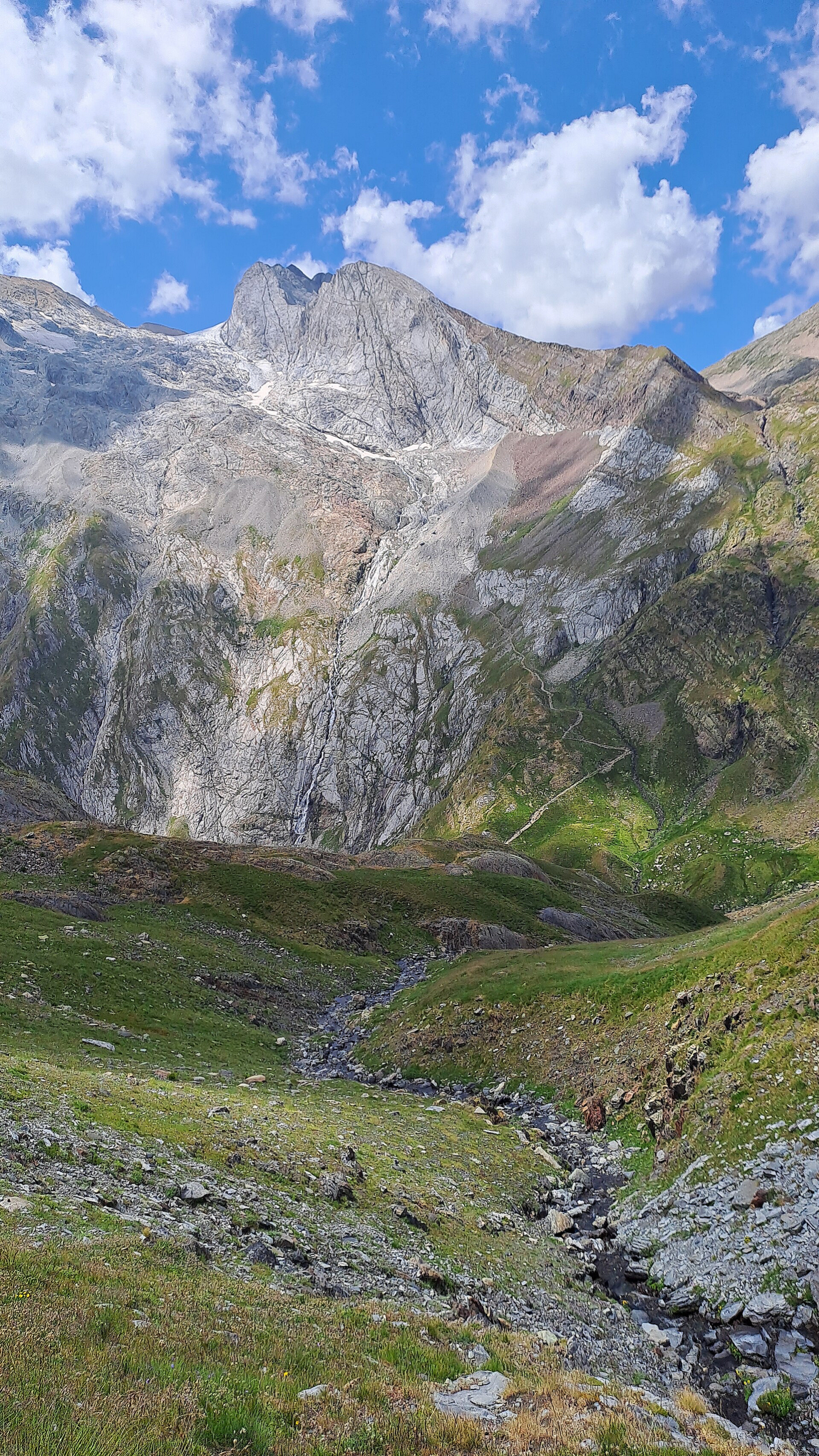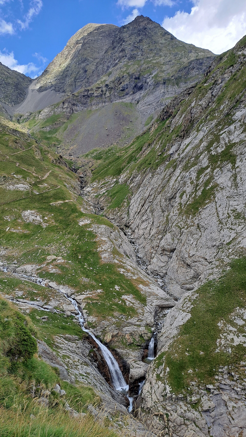 The path kept on descending down the impressive valley, with the Ruisseau des Oulettes being fed with waterfall tumbling down from the giants above, and also itself tumbling down a few cascades. This all added to a lovely finale to the trekking day.