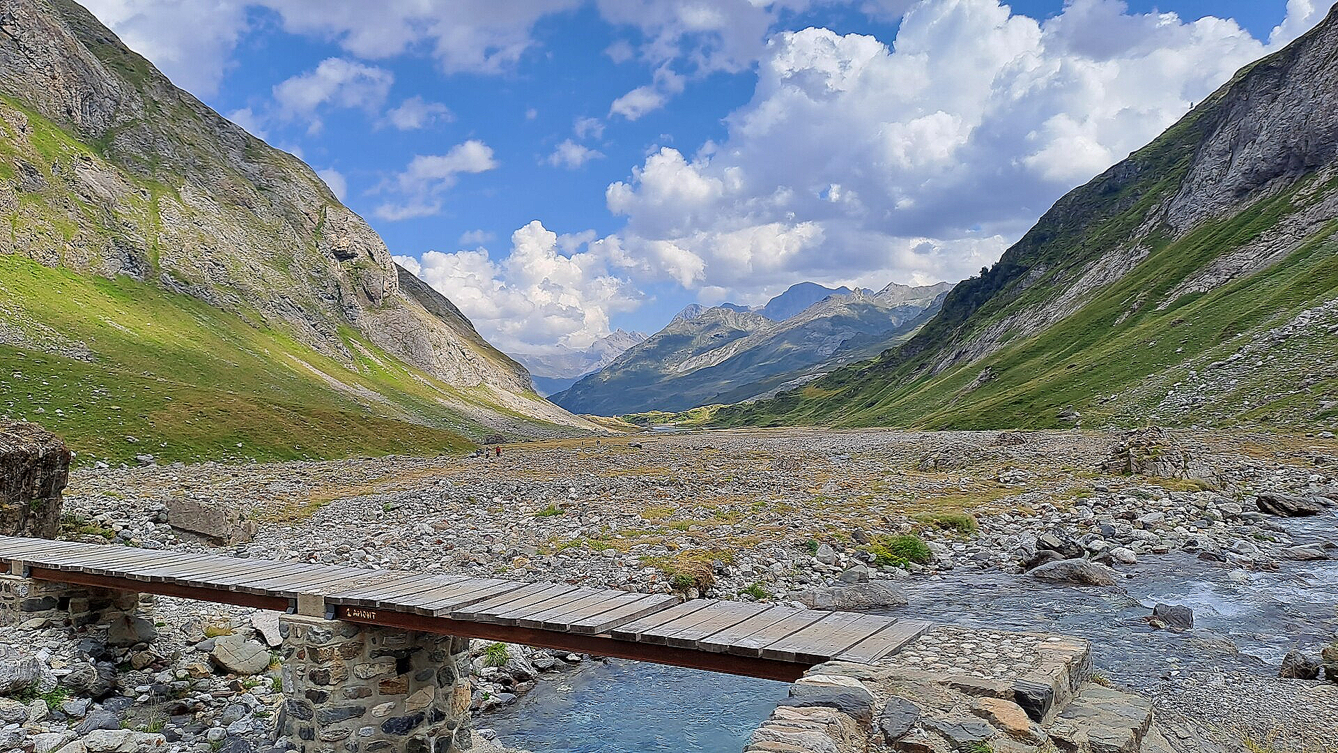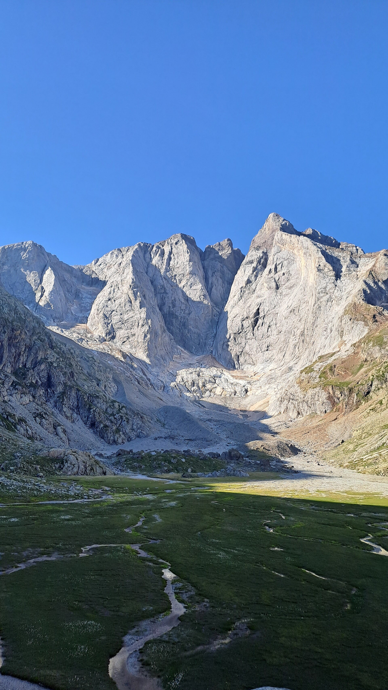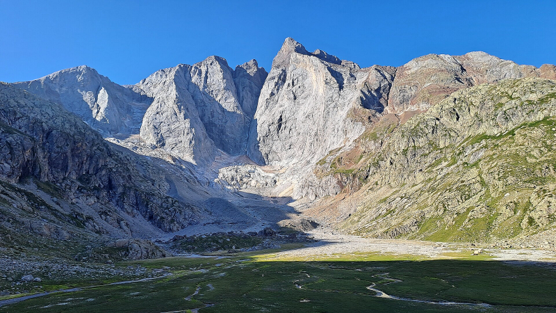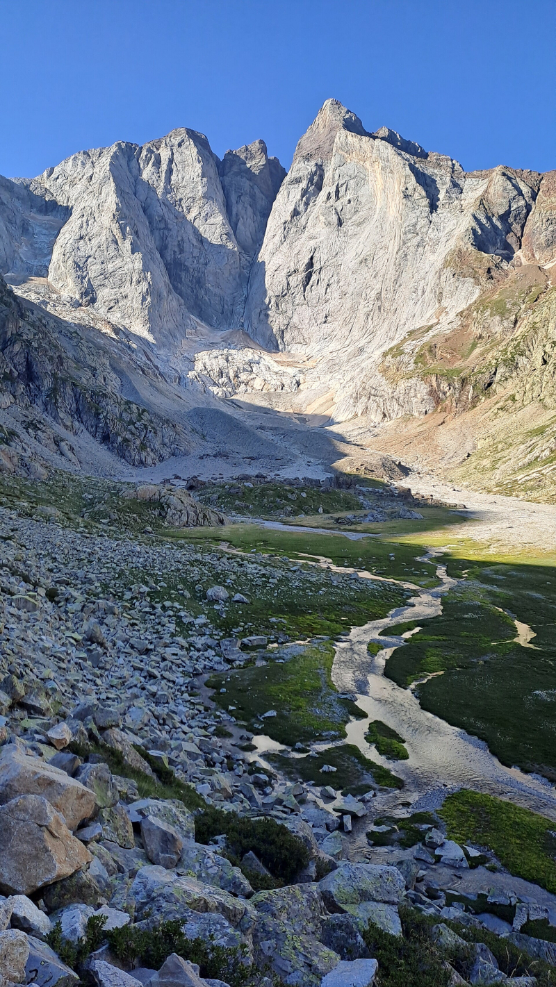 The path kept on descending down the impressive valley, with the Ruisseau des Oulettes being fed with waterfall tumbling down from the giants above, and also itself tumbling down a few cascades. This all added to a lovely finale to the trekking day.