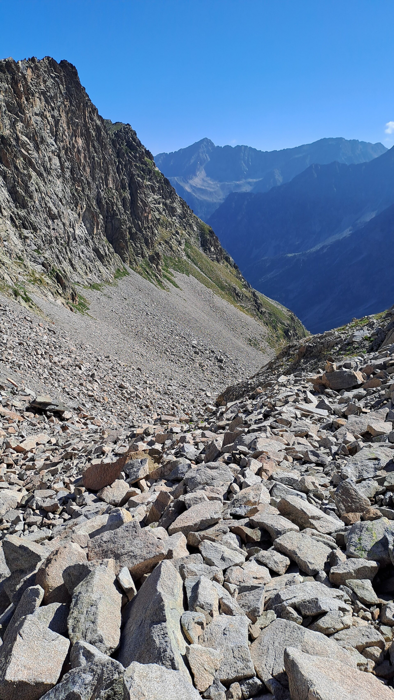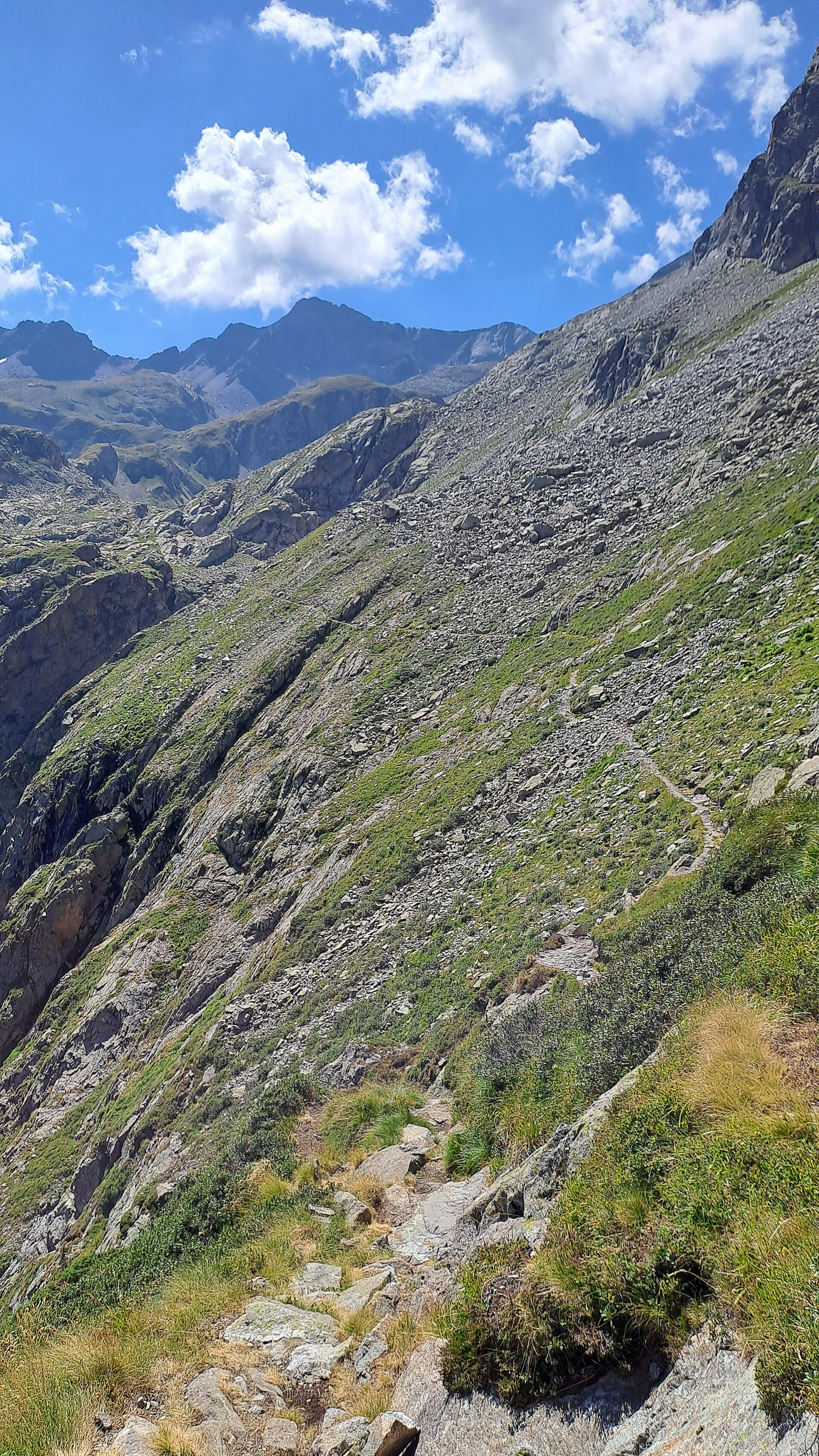 Once up the boulder field, the view over the other side of Col d'Arraillé was of a spectacular steep sided valley, with the path barely visible making its way high up along, and then down the left side of Pic d'Arraillé (2759m) as I looked at it. This meant negotiating another boulder field, and scree, with cairns again marking the safest route. It's an immense feeling being within these boulder and scree fields.