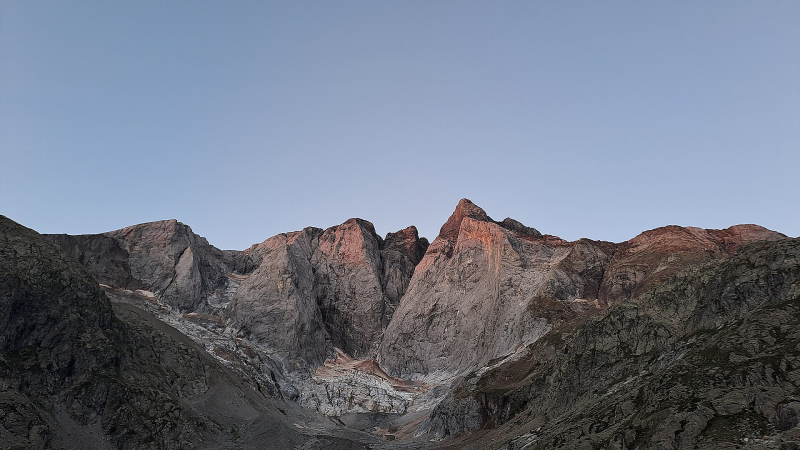 I had a very comfortable nights rest at the foot of Vignemale's North Face. It was unbelievable to wake up, unzip the tent and have such majestic beauty right there in front of me. I lay for a while (after bladder emptying!) with the tent doors rolled up just marvelling at the mountain with it's sadly retreating glacier, awaiting the sunlight to start changing the deep greyness of it.