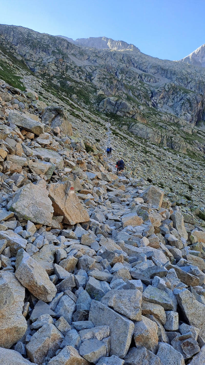 To start my 'adventure circuit' I had to leave the GR10 a short way into the climb from the Refuge, and say my temporary goodbye and apologise for the deviation. It feels strange leaving the trail, but if I didn't get lost we'd be reunited later in the day! The first order of play was a steep climb up a boulder field to Col d'Arraillé (2583m), a very narrow pass between Col d'Arraillé (2759m) and Pic de la Sède (2976m). I had climbed this a few years before and remembered how easy it can be to lose the path! You have to keep a close eye out for cairns ahead of you and then it's OK to navigate!