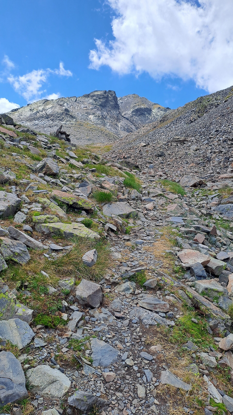 The path now headed up towards the highest target of the Col des Gentianes (2725m), which is sandwiched between Pic d'Estom Soubrian (2829m) and Beche de Pouey Mourou (2777m). Cairns were definitely the order if navigation here, but with the visibility fine and those clouds not developing into a storm is was fine! It was so beautiful and exciting, apprehension was being fully felt as excitement now! Such a fantastic place to be trekking and to experience.