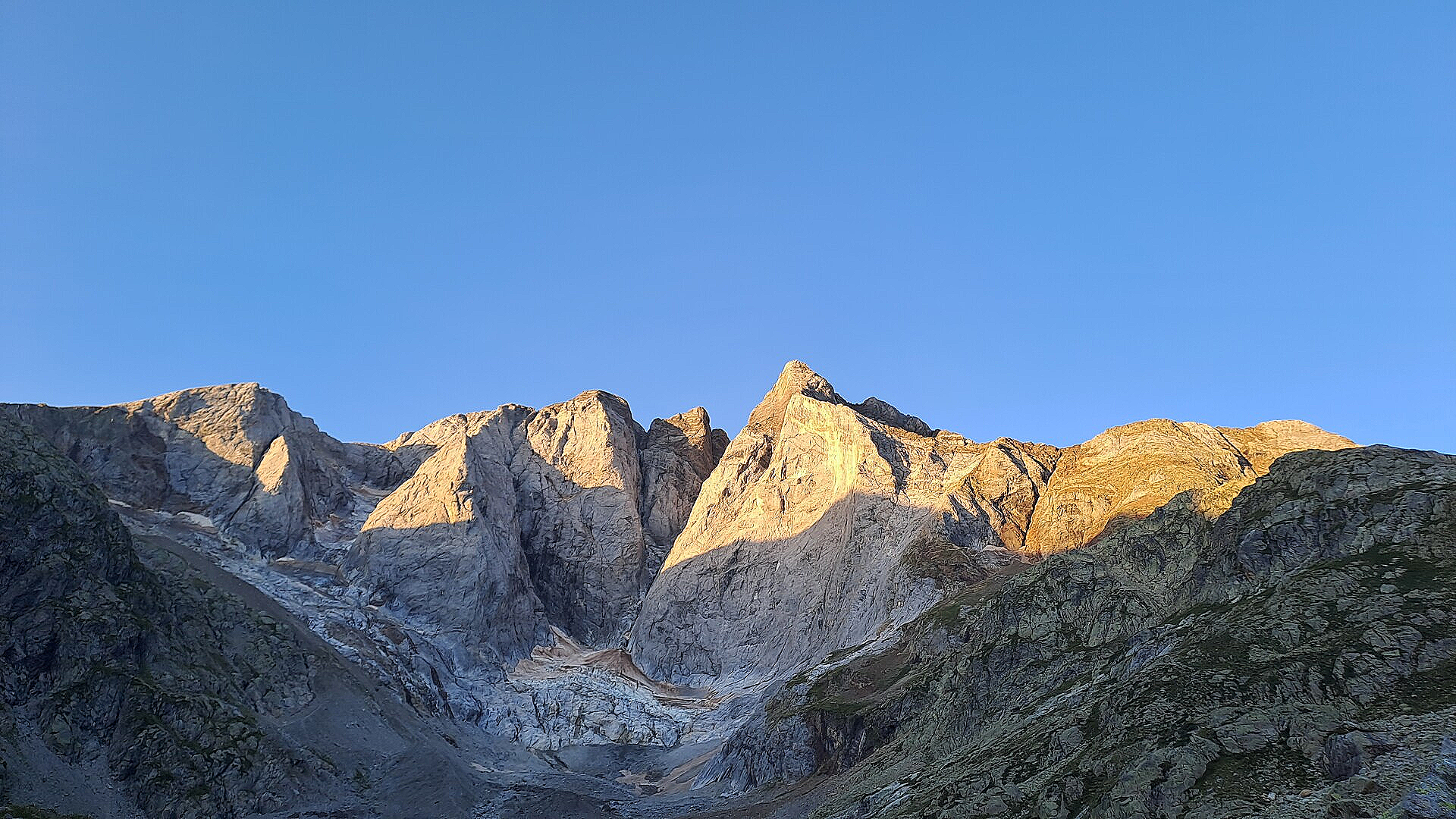 As the sunrise aged the red colours faded to yellowy shades, before the lighter grey version of the Vignemale Massif was on display for the day! It was 08:00 and time to sadly break camp, as here tents must be down by 09:00. It was chilly out of the sun, usual finger problems, but I knew a coffee at the Refuge was close, as was the warming sun!