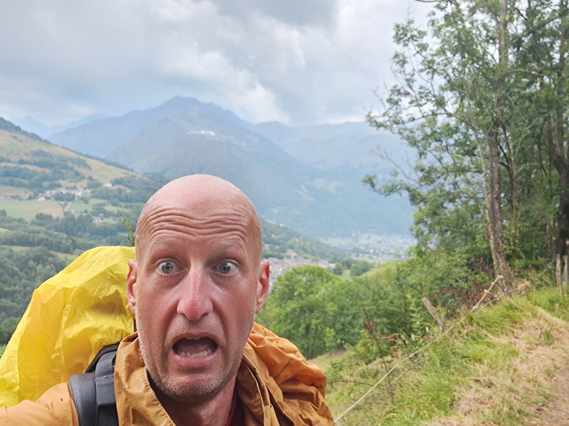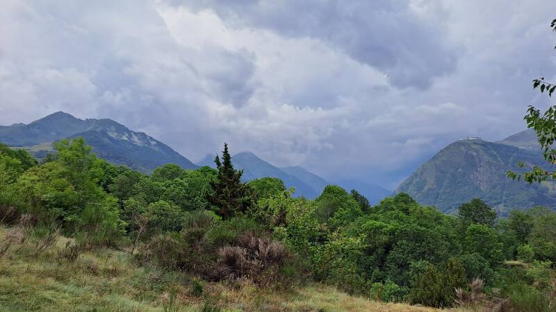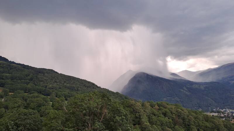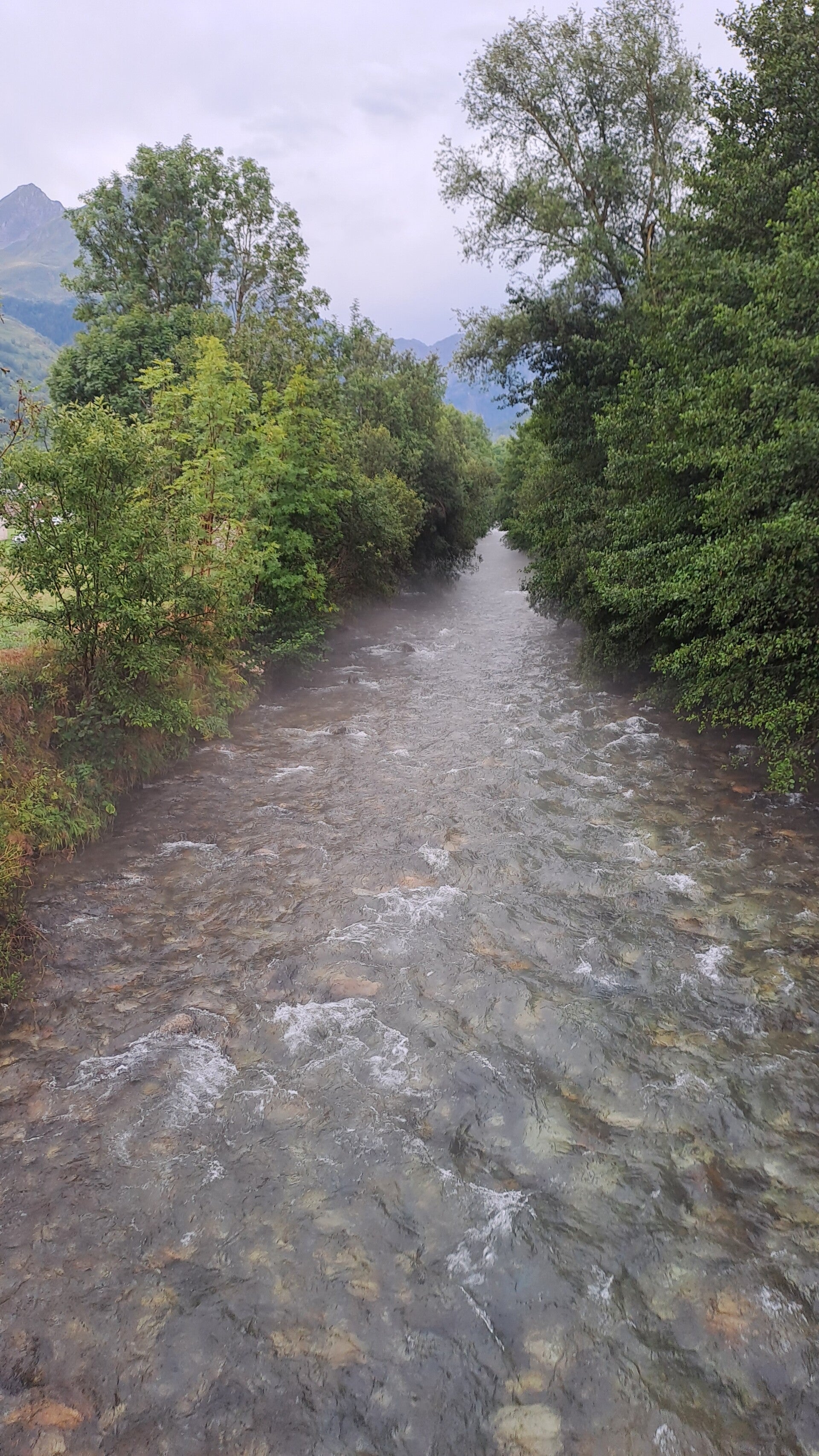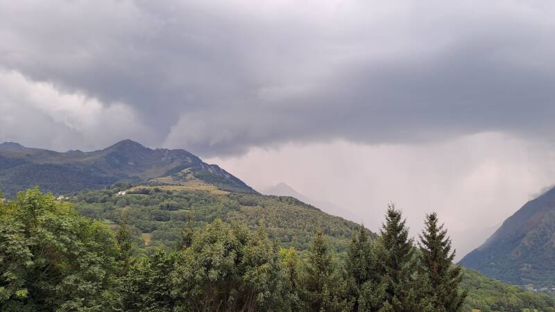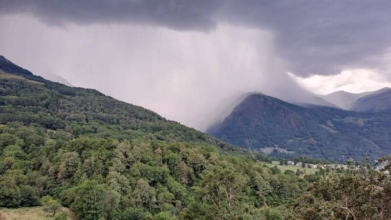 Approaching Col d'Azet (1580m) was a relief as I was definitely ready to start trying to get a tiny bit sorted from this wet afternoon. However, I was increasingly concerned this could only be achieved tomorrow! The descent to Loudenvielle (970m) was a speed descent, well as much as was possible in the very slippy conditions. I could see the campsite, like an oasis in a desert. Except this was no desert, this was the soaking Pyrenees!