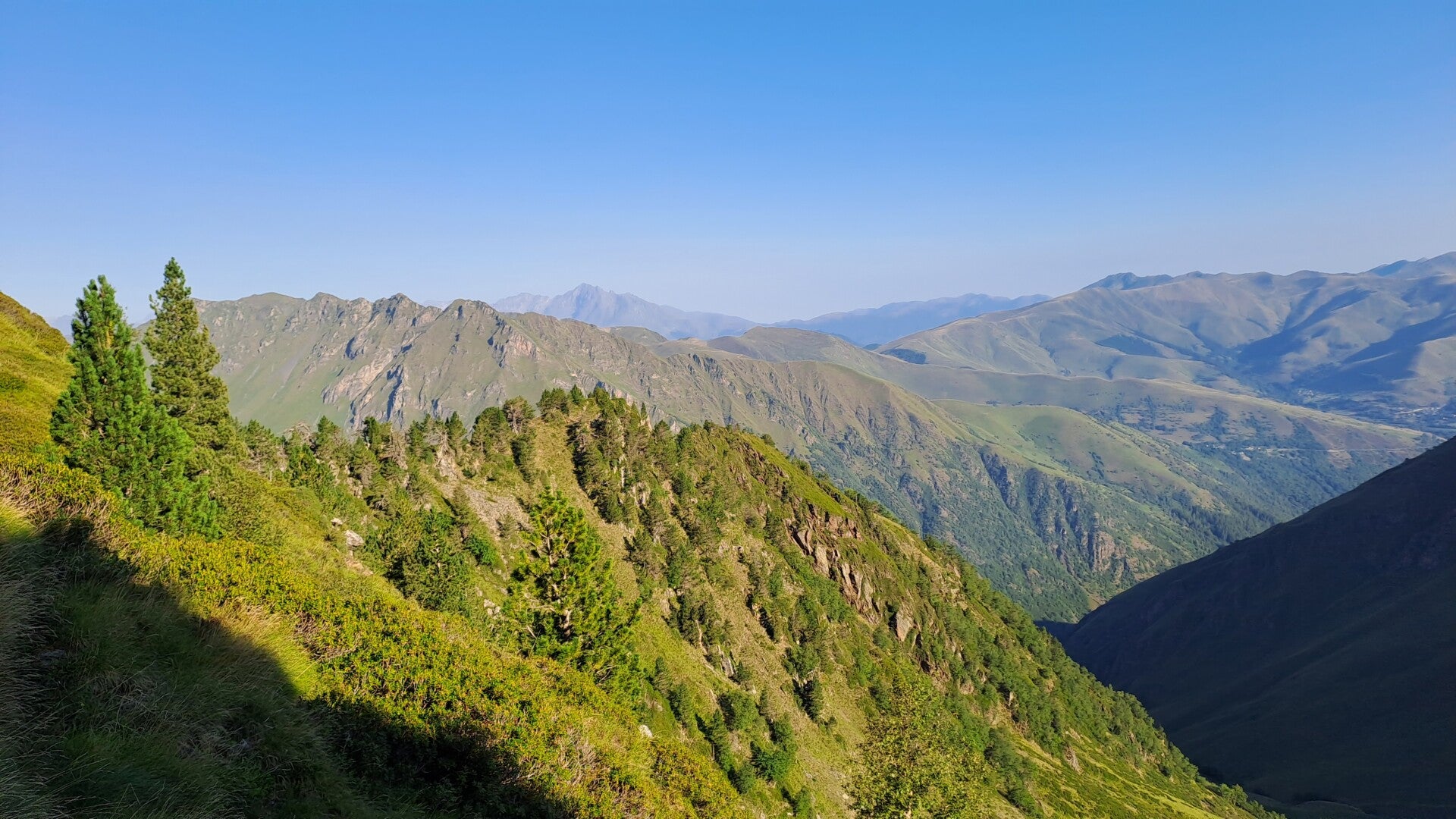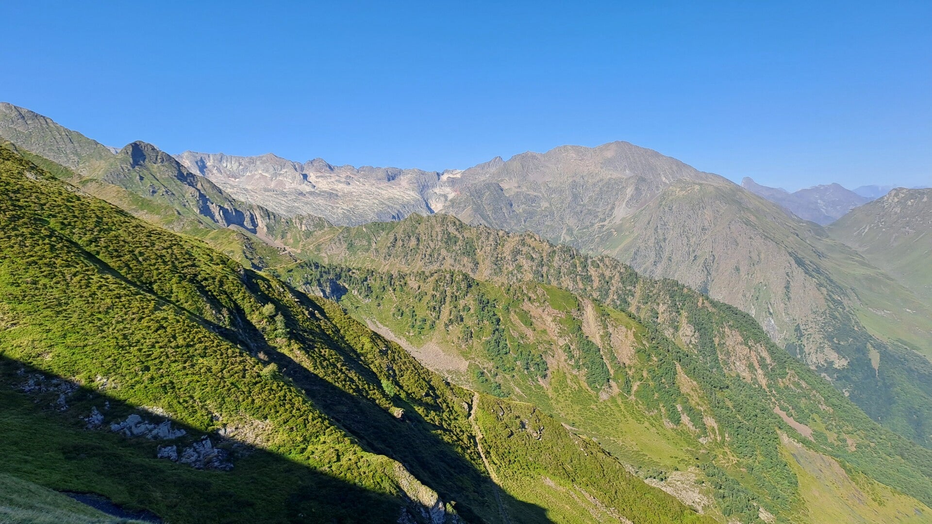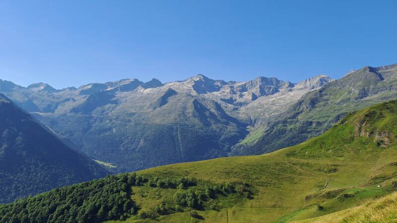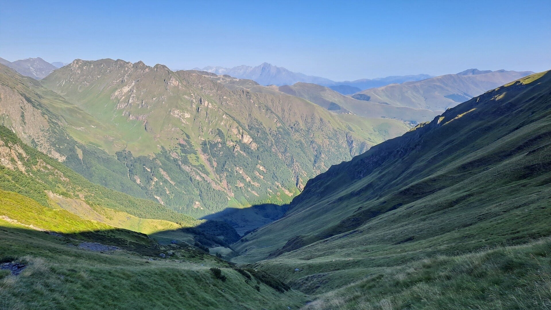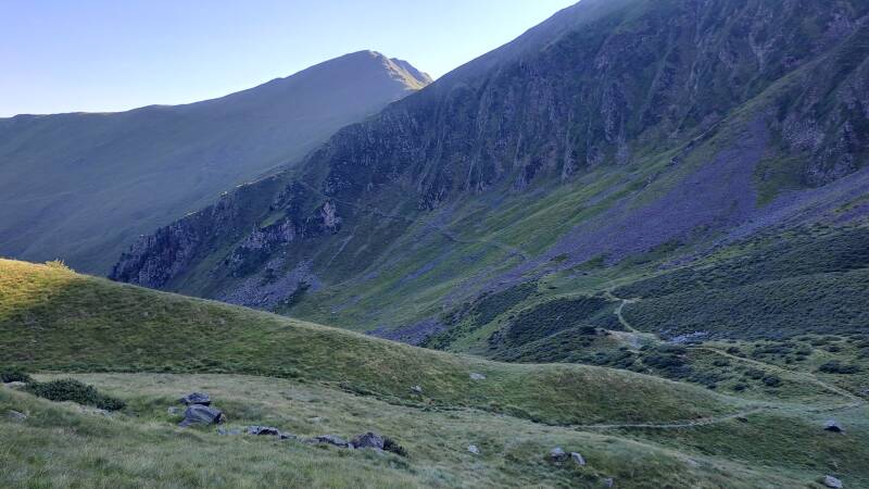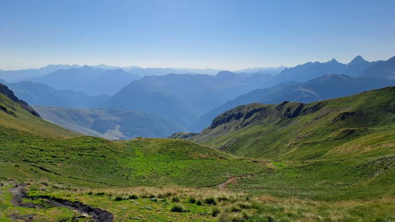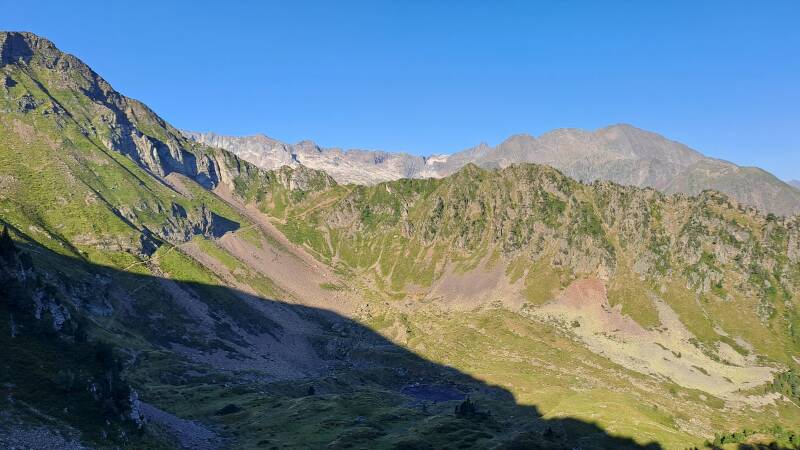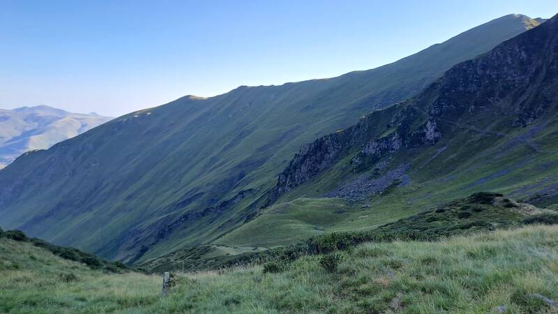 Once the young guy had departed, I had a nice and slow breaking of camp in the amazing surroundings I had been blessed to call home for the night. I find it difficult to leave camp spots like last night's but it was time to start the day's hiking. Initially there was a short, switchbacking climb out of the cliffs of Cap des Hount-Sec (2698m) which took me round onto a traverse of the cliffs of Pic de Subescale (2436m). Really impressive views down the steep sides of these mountains, giving me a view of the valley I'd crossed and climbed out of yesterday. The horizon was clear and beautiful, it was a great morning.