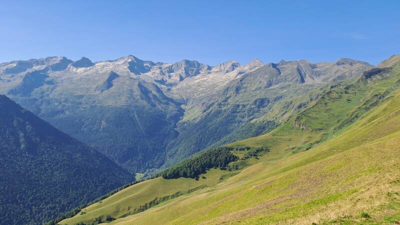 The path started another shortish climb up to Col de la Coume de Bourg (2272m) which was between the grassy mountains of Pic de Céciré (2403m) and Pic de Subescale (2436m). Quite soon into the descent I could see the ski resort of Superbagnères in the distance to my left. Had to be good for the morning café au lait! As I progressed into the descent the developing view behind was the highlight of the day! It was a magnificent vista of the upper reaches of the huge granite blocks of Cap des Hounts Sec (2698m), Petit Quayrat (2847m) and Grand Quayrat (3060m). Maybe even Pic de Hourgarde (2964m) was poking it's peak in there as well? Fantastic, imposing masses of rock with sheer cliff faces! It was the high terrain that last night's storm developed over. The only shame was it was behind me, but that certainly allowed for good breaks to stop and admire the view in the now very hot sun!