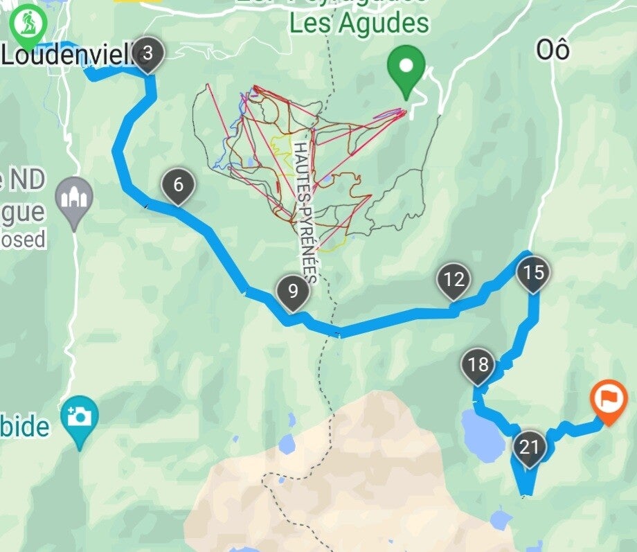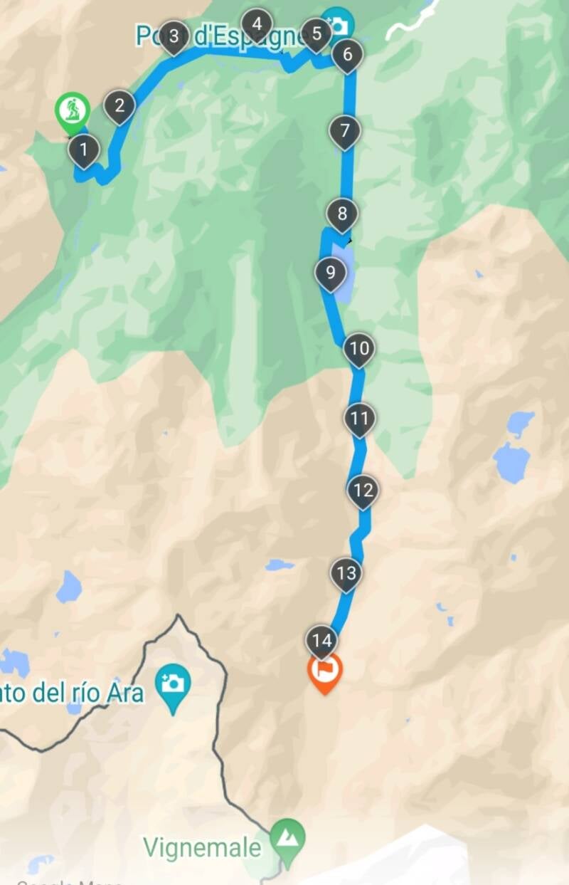 - Finish: Wild Camp on North slopes of Cap de Hounts-Secs (circa 2210m)