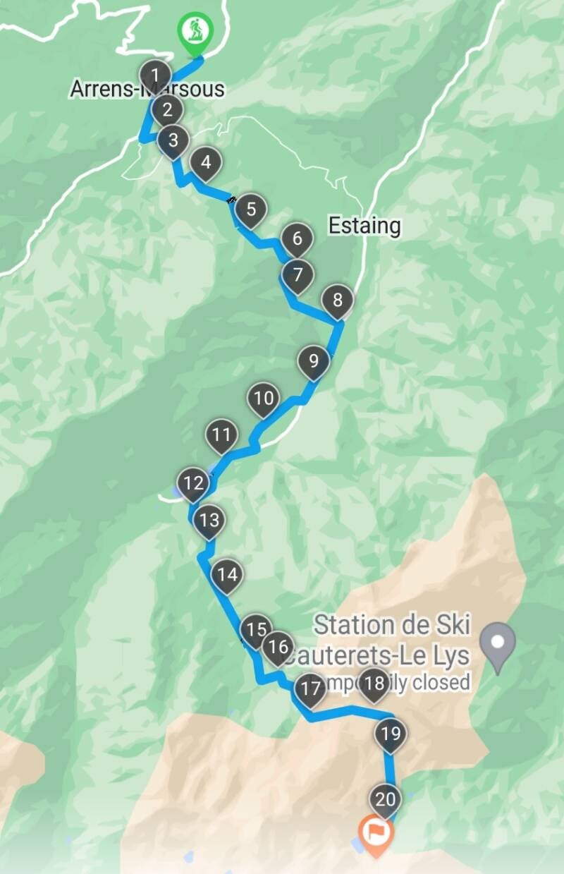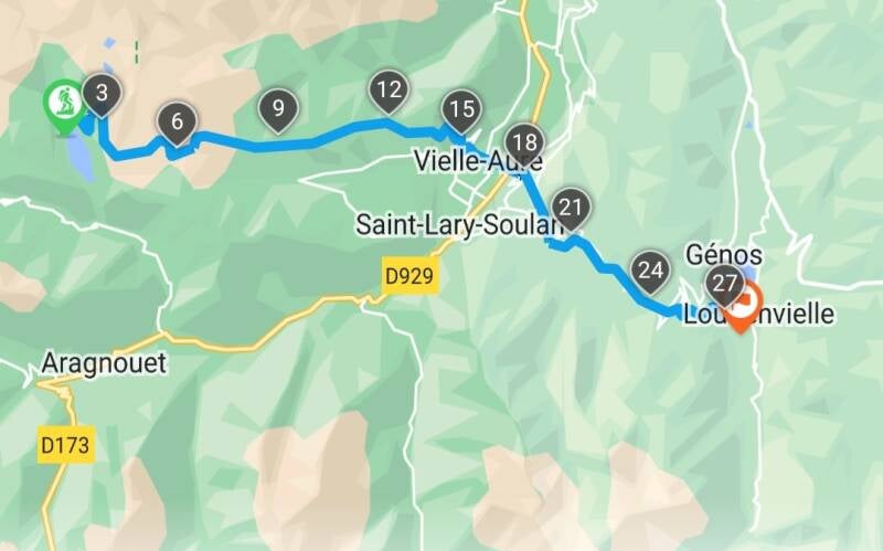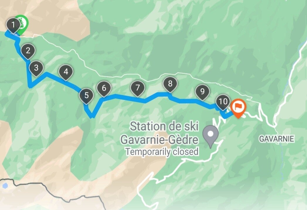 - Finish: Aire de Bivouac at Barage d'Ossoue (1834m)