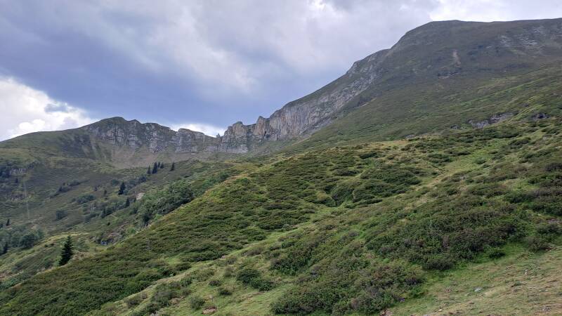 There was a dip and a rise to traverse across a steep cliffside of Pic de la Hage (2165m) to get to the Col d'Esclot d'Aou (2093m), that took me between Pic du Burat (2154m) and Pic de la Hage.