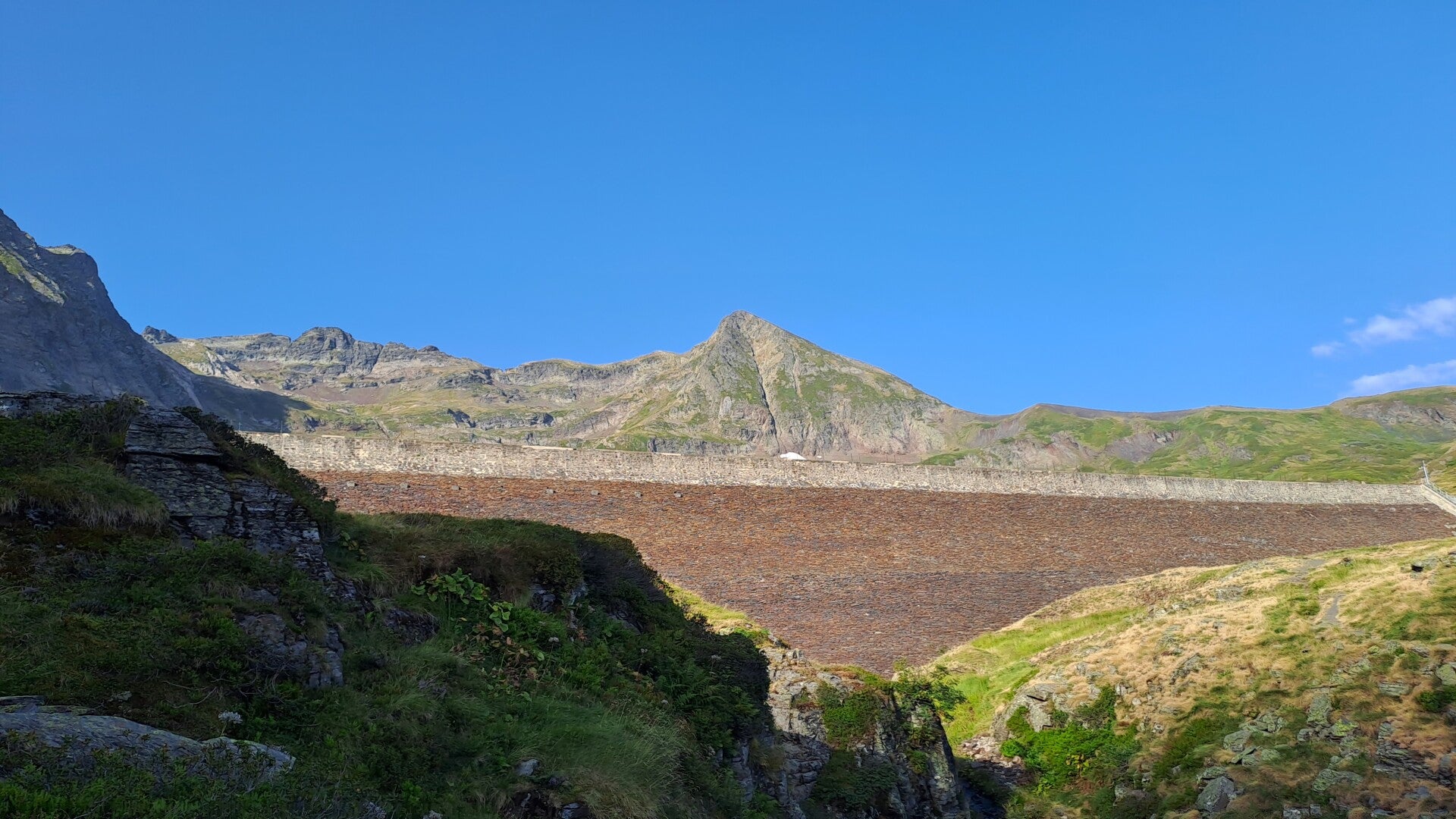 After the coffee and a warm up in the sunshine it was time to set off for the short day I had planned. The GR10 descended a bit from Refuge de l'Étang d'Araing (1950m), and crossed the dam at it's base. With simply a thick wall between me and millions of tonnes of water I couldn't help but wonder what it would be like if it burst on me - why does my mind work like this I mused as I crossed and started the climb up to Serre d'Araing (2221m).