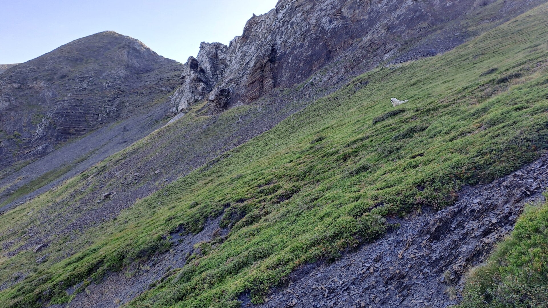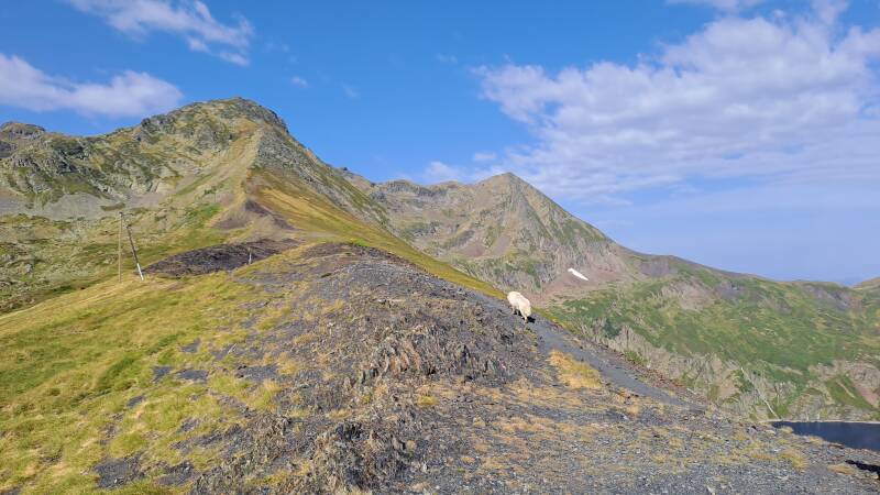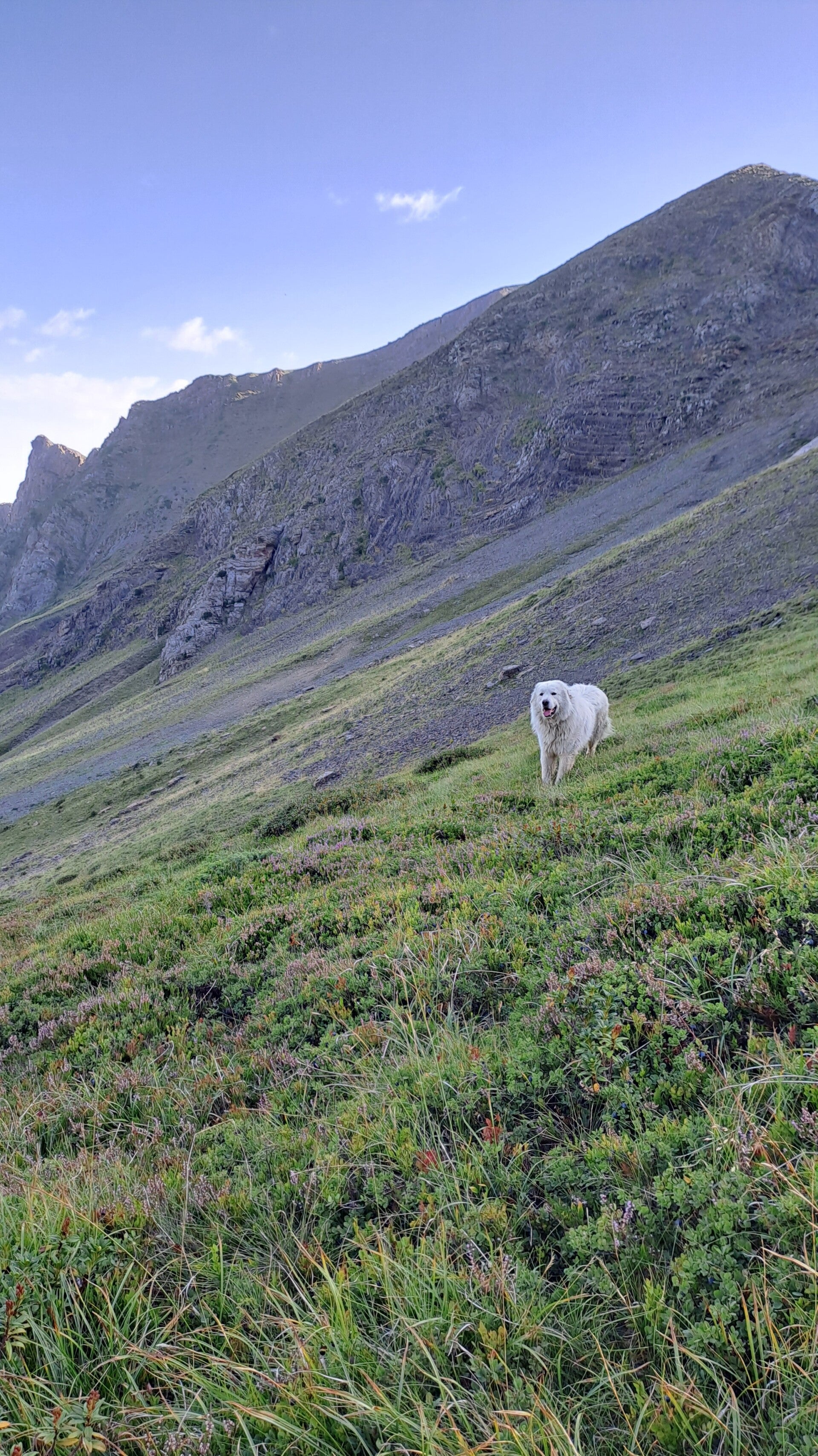 Towards the top a Patou dog appeared and sat down to survey the scene. These dogs are so deceptive, they look nice and dog like but they aren't dogs as you know them. These are truly still wild dogs and they know their purpose doesn't involve humans! As I approached the surveying Patou (a female I think), she started a bark that was deep and meaningful. This was responded to by other similar barks from above! I continued to climb, trying to be nonchalant as she followed me at quite close quarters continuing to bark! Turns out she had herded me into view of a giant of a male Patou looking down and barking as if to say 'Don't dare come this way pal'! There was one big problem - he was sat on the GR10 just before Serre d'Araing!
