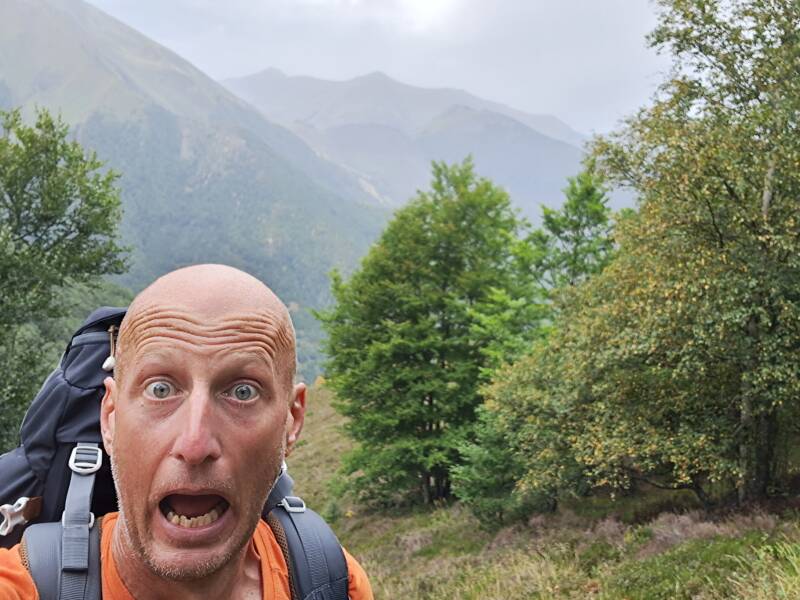 So, this face tells you that things didn't remain marvelous! The aire de bivouac area wasn't the Riverside paradise I imagined, it was OK. However, what was definitely not OK was my choice of camping spot! I thought it would be nice to set up right near the river, on some ground that looked good. I was convincing myself it was fine as I realised this was a bit of a toilet area maybe, and a spot where people come down to wash! But as the storm hit I resigned to spending the night there - that was until I started to wonder why water was gathering around my tent?! I had managed to pitch exactly in the flow of rainwater to stream, and things weren't looking good for me!