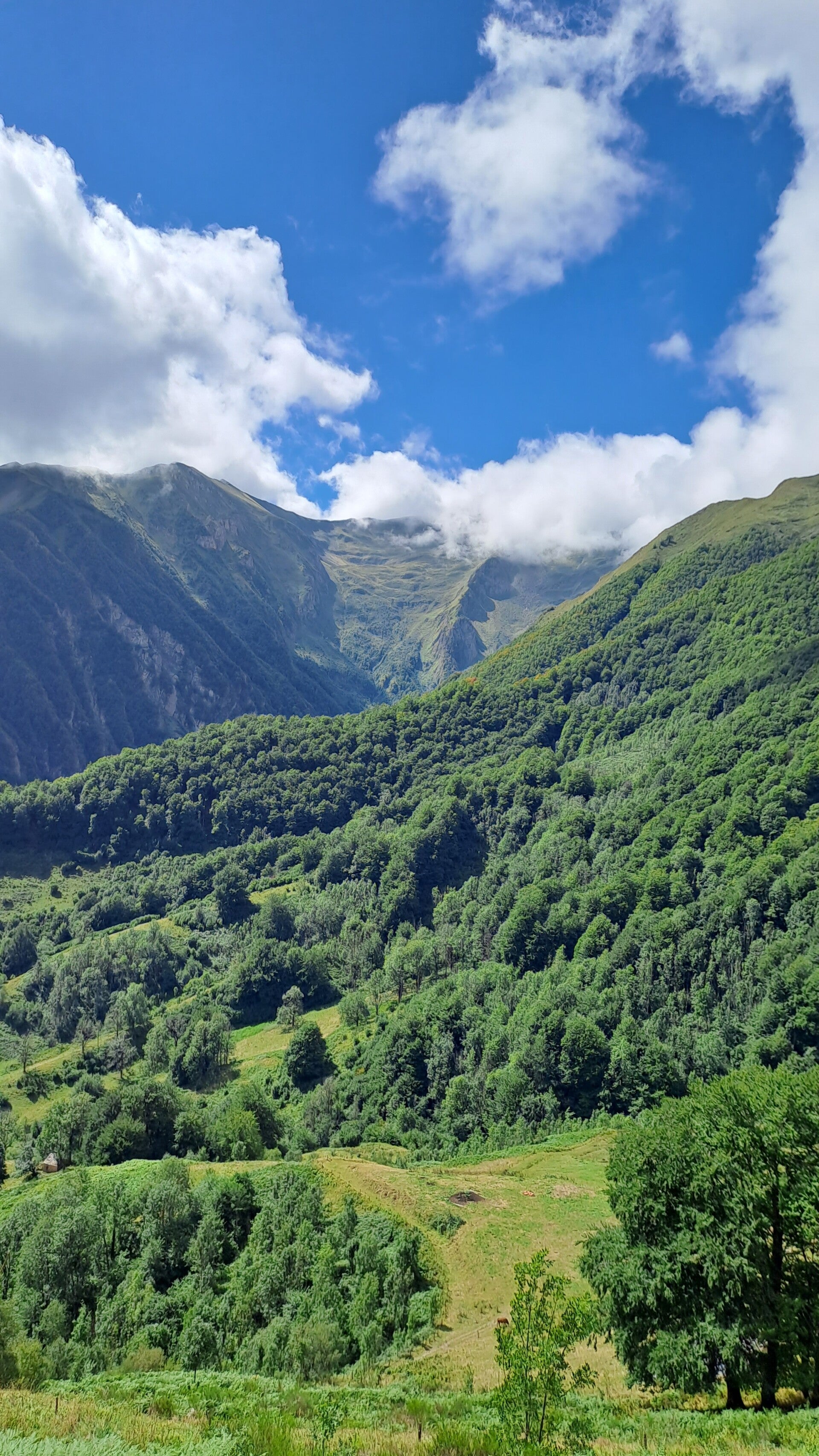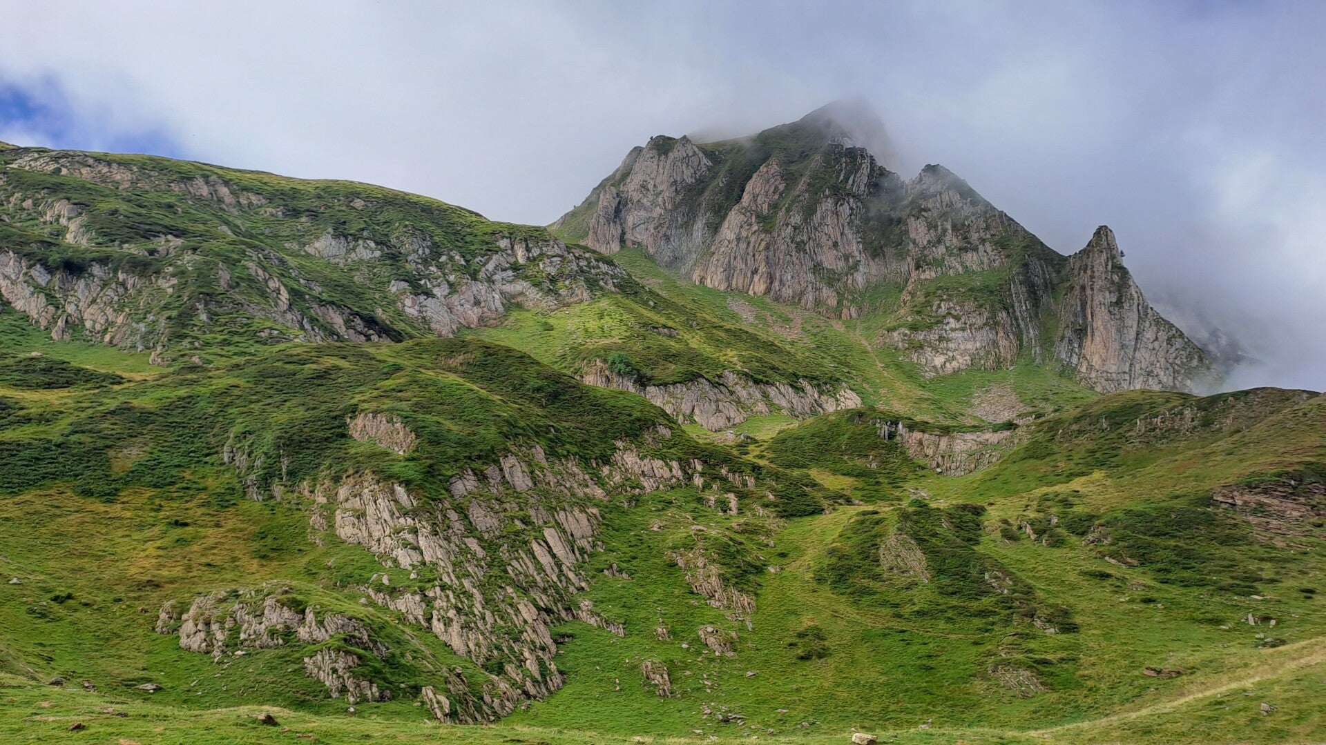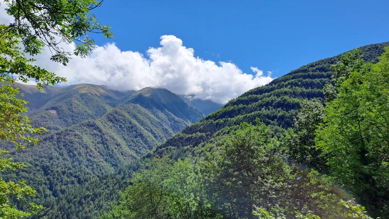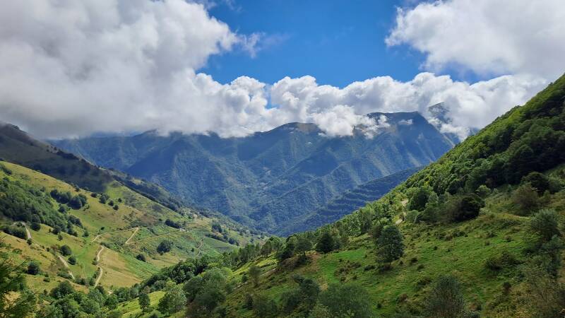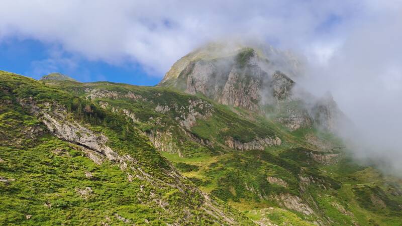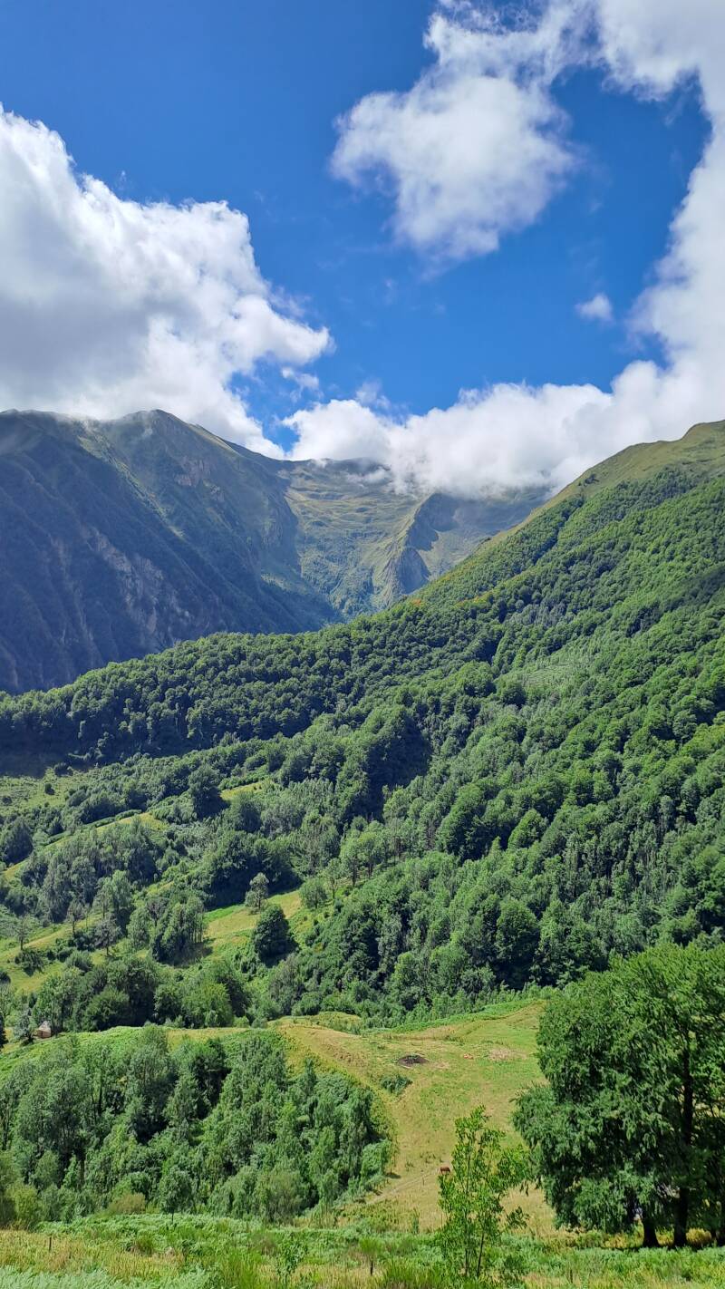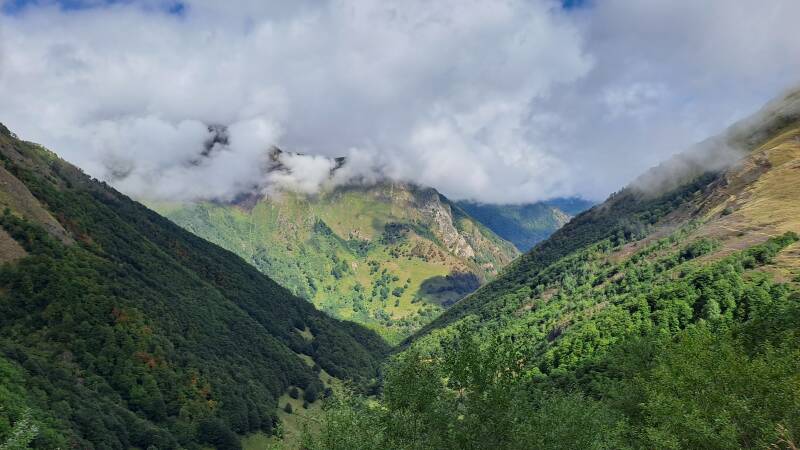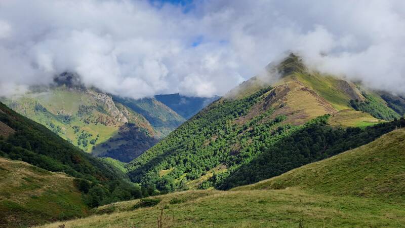 Having escaped the talking to, I made haste down a track to Col de Pause (1527m). Nothing of note there, but it did open up a lovely new panorama of green, tree covered mountains ahead. The track down to the Col had offered fantastic views through a gap between Tuc de Fourmiguet (2093m) and Pic de Fonta (1934m) back through to the impressive Cascade d'Arcouzan area where I got so soaked yesterday! It looked like I expected it would in good weather, as things had cleared up nicely.